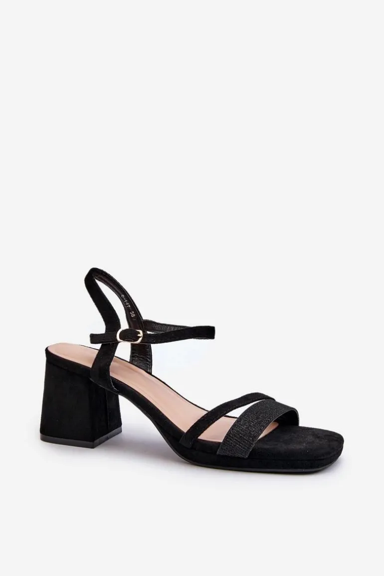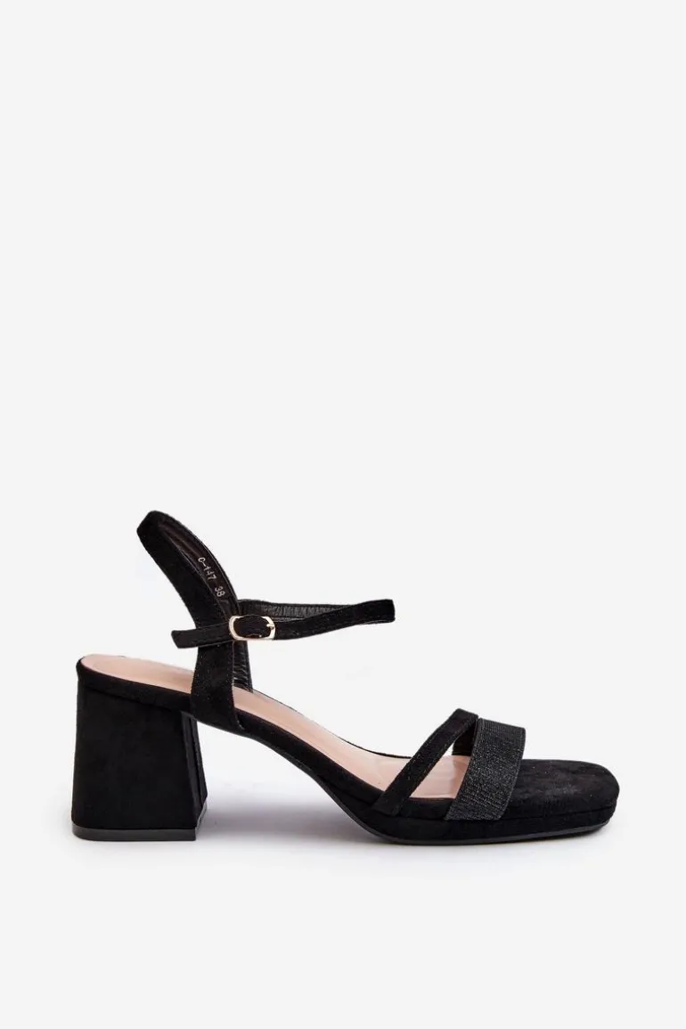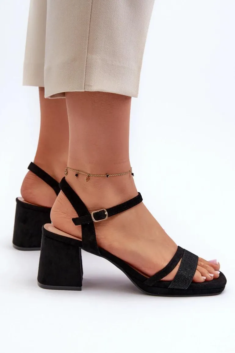 Sandały damskie wykonane z eko skóry. Osadzone na obcasie w postaci słupka. Zapinane na regulowany pasek ze sprzączką, gwarantują idealne dopasowanie do stopy. Z przodu dwa paseczki, dodatkowo jeden obszyty jest błyszczącą nicią, dodając im delikatnego blasku. Te sandały będą doskonałym uzupełnieniem każdej letniej stylizacji! Przy wyborze rozmiaru prosimy sugerować się tabelą rozmiarów.