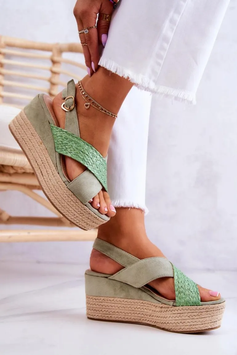 Sandały na wysokiej platformie zdobione lnianą plecionką oraz eko zamszową skórą. Zapinane na regulowany pasek ze sprzączką. Dwa skrzyżowane paski stabilizujące stopę wykonane z zamszowej eko skóry oraz tworzywa sztucznego. Buty świetnie komponują się z długimi sukienkami. Miękka, eko skórzana wkładka pozwoli na użytkowanie sandałów przez cały dzień. Idealne do pracy, spotkanie ze znajomymi czy weekendowy wyjazd. Przy wyborze rozmiaru prosimy sugerować się tabelą rozmiarów.