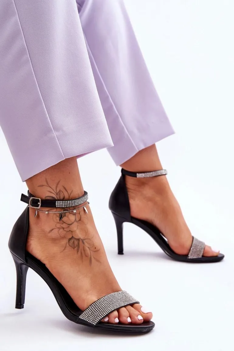Śliczne sandałki wykonane z eko skóry. Model ten posiada paseczek z dżetami imitującymi cyrkonie. Sandałki osadzono na obcasie w postaci szpilki. Zapinane są na regulowany pasek ze sprzączką, przy którym jest dodatkowo elastyczna gumka. Model ten posiada usztywniany zapiętek. Przy wyborze rozmiaru prosimy sugerować się tabelą rozmiarów.