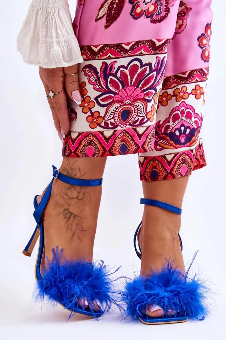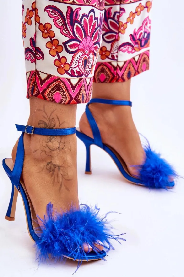 Cudowne sandałki damskie osadzono na obcasie w postaci szpilki. Model ten został wykonany z materiału tekstylnego. Sandałki posiadają na przodzie delikatne piórka, które z pewnością Cię zachwycą! Posiadają odkryty, kwadratowy nosek. Zapinane wokół kostki na regulowany pasek ze sprzączką. Przy wyborze rozmiaru prosimy sugerować się tabelą rozmiarów.