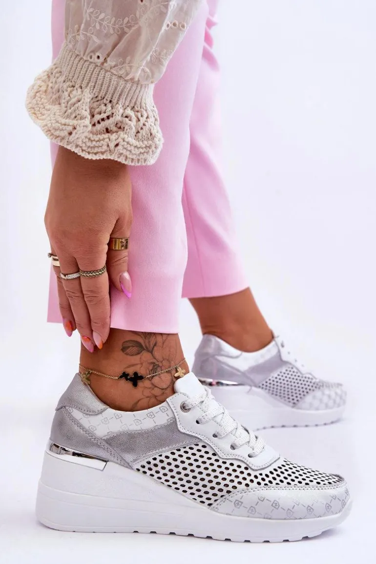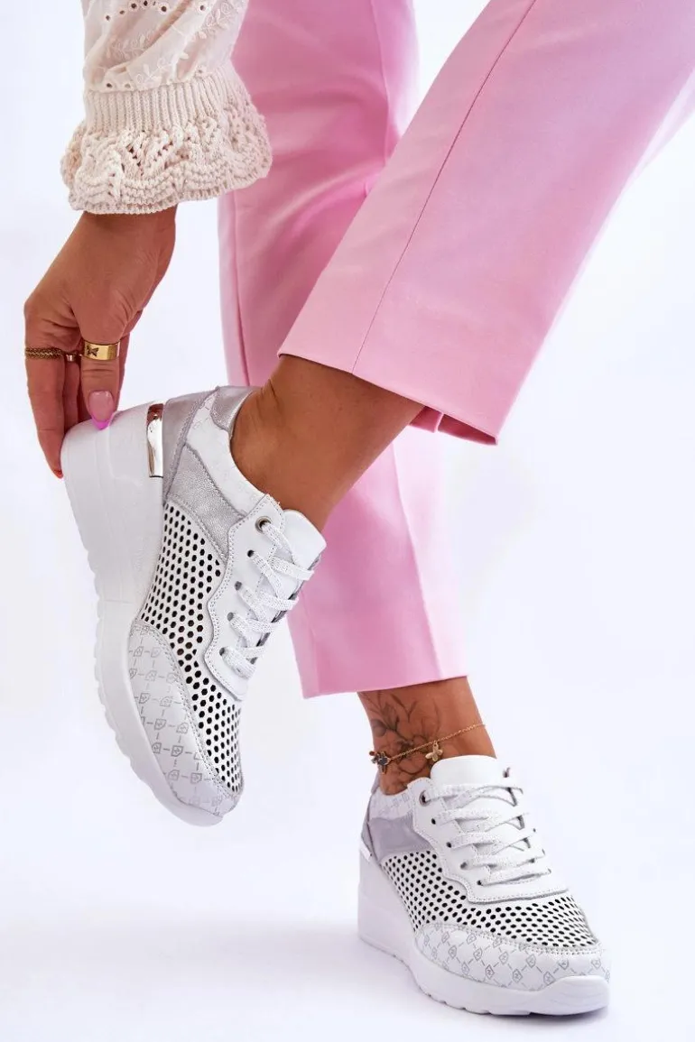 Klasyczne buty sportowe zostały wykonane z wysokiej jakości naturalnej skóry, która dodatkowo posiada ażurowy wzorek. Te buty sportowe posiadają także wygodną, wykonaną z naturalnej skóry wkładkę Comfort. Buty zostały osadzone na platformie wraz z koturnem. Dodatkowo w obcasie jest umieszczony lustrzany element. Model klasycznie sznurowany. Przy wyborze rozmiaru prosimy kierować tabelą rozmiarów.