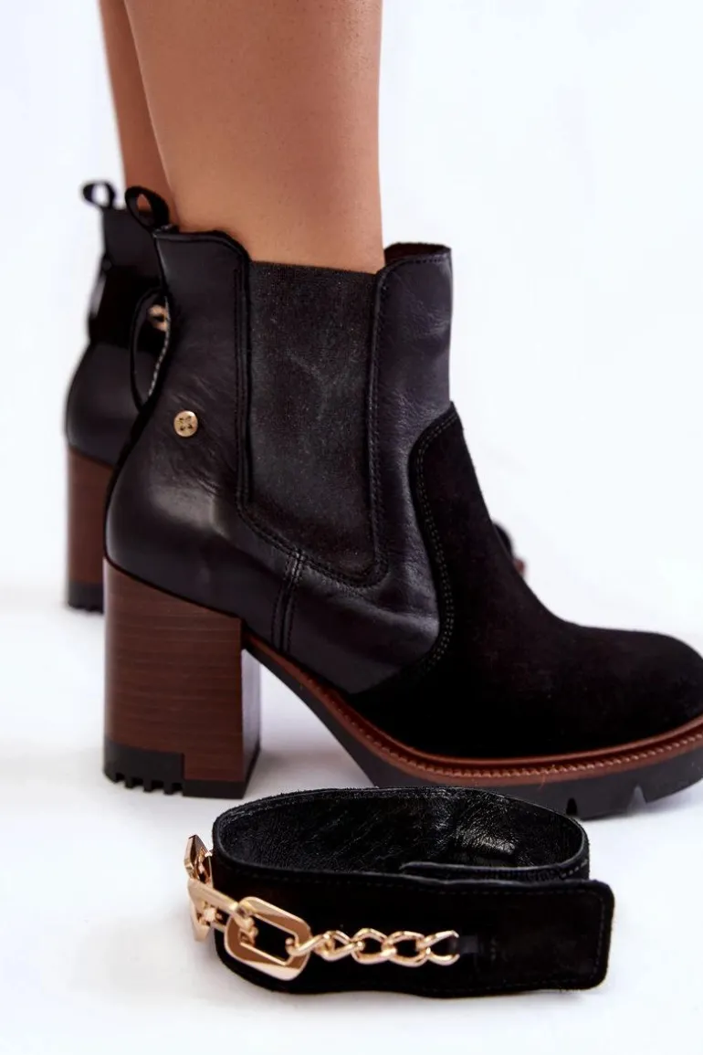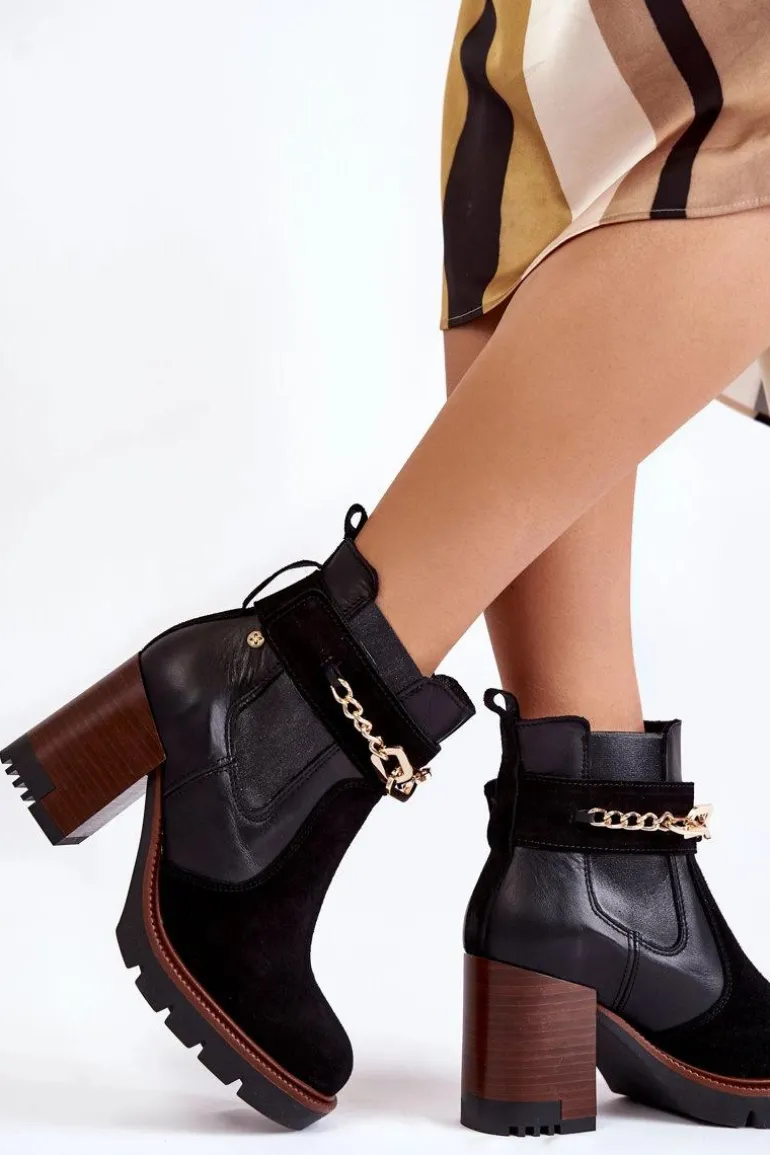 Botki damskie marki Maciejka zostały wykonane z najwyższej jakości skór. Posiadają ozdobny paseczek z łańcuchem, który jest zapinany na rzep. Botki posiadają modne przetarcia. Osadzone na obcasie w postaci słupka oraz platformie z bieżnikiem. Środek został ocieplony kocem obuwniczym. Miękka wkładka zapewni komfort podczas użytkowania. Przy wyborze rozmiaru prosimy sugerować się tabelą rozmiarów.