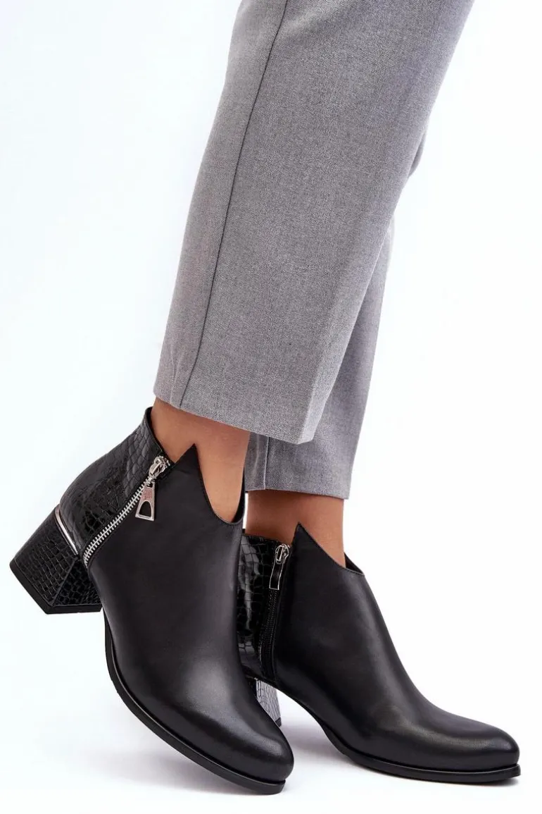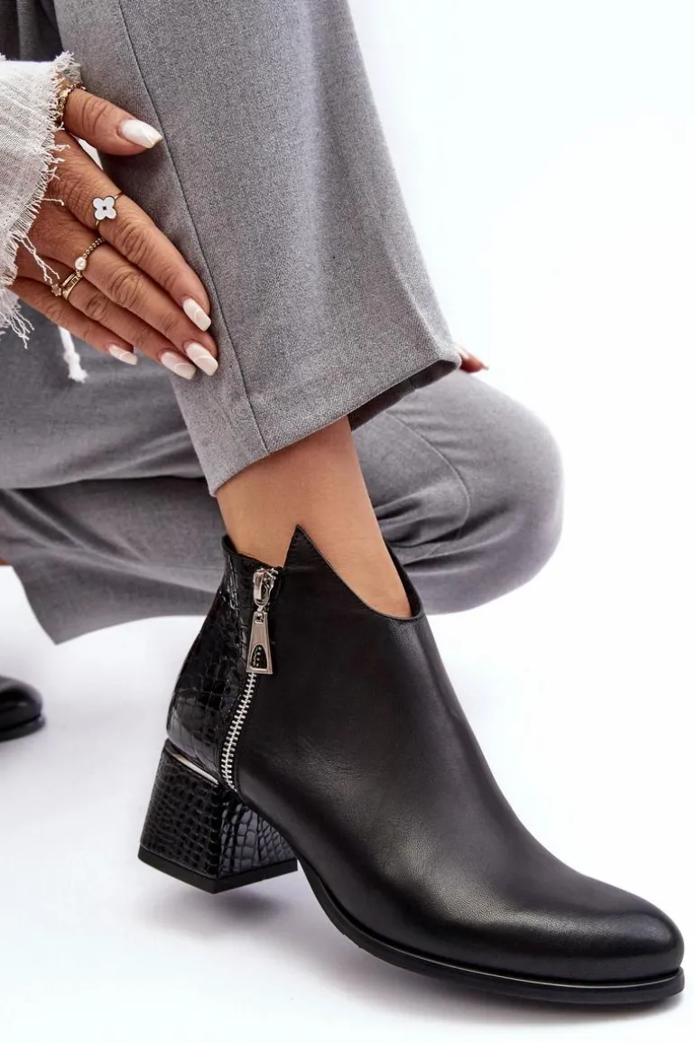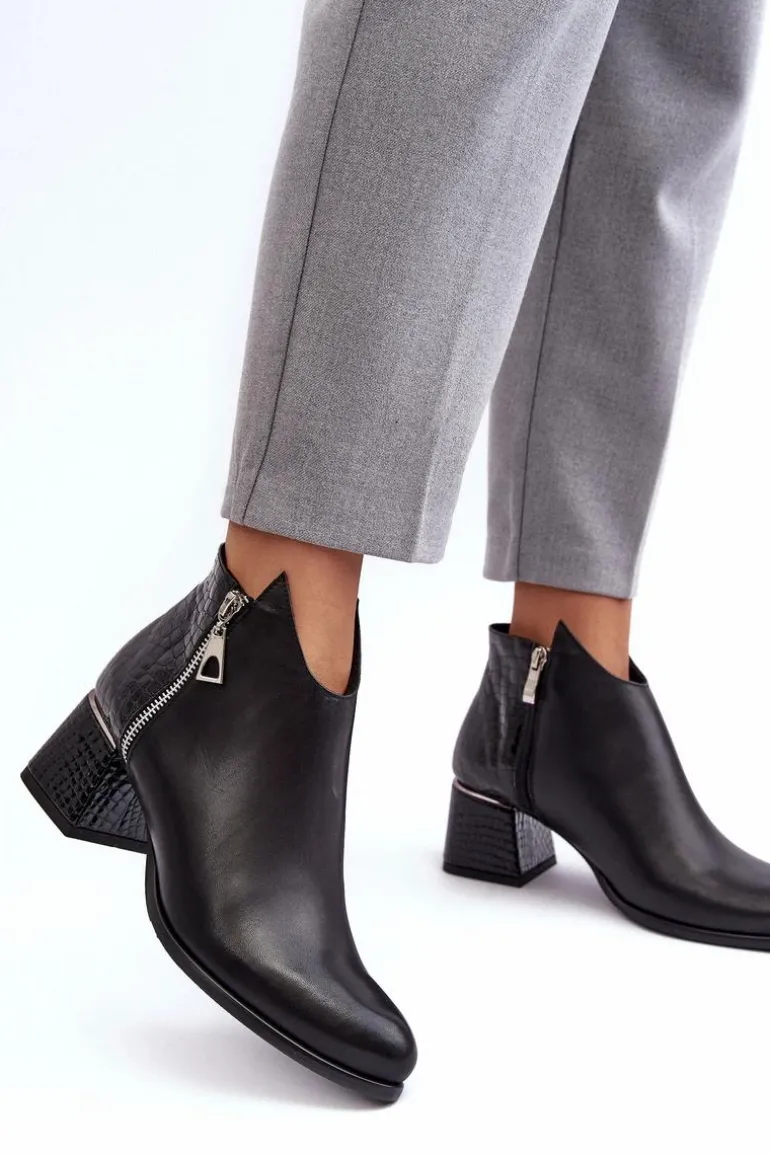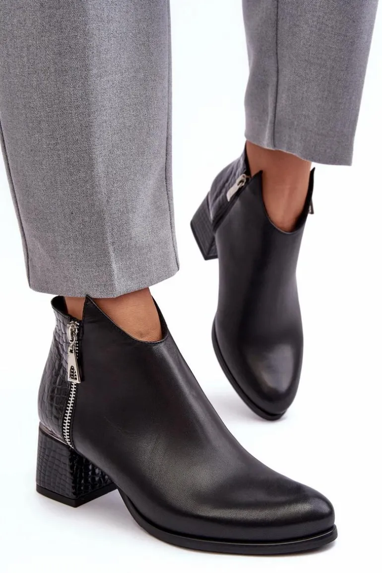 Rewelacyjne, damskie botki na obcasie w postaci niskiego słupka posiadają cholewkę za kostkę. Zostały wykonane z wysokiej jakości skóry naturalnej. Model ten jest zapinany na suwak. Dodatkowo posiada także ozdobny suwak po zewnętrznej stronie. Botki posiadają usztywniany zapiętek. Buty te zostały ocieplone kocem obuwniczym. Ten model świetnie sprawdzi się w wielu stylizacjach! Przy wyborze rozmiaru prosimy kierować się tabelą rozmiarów