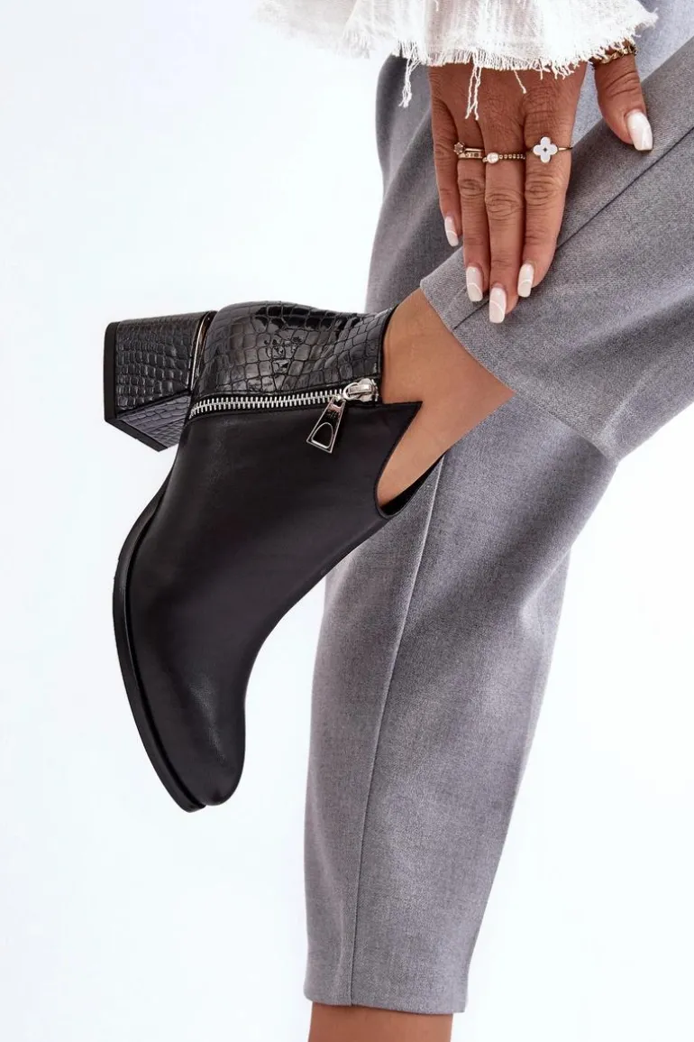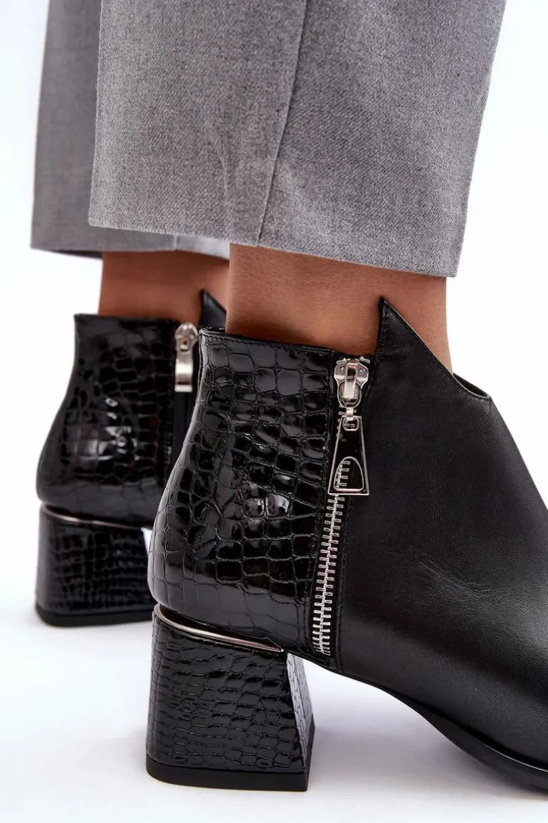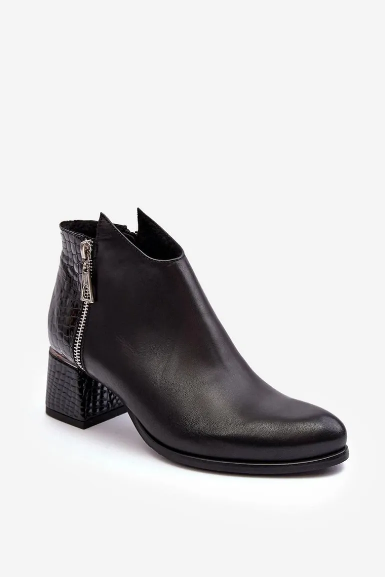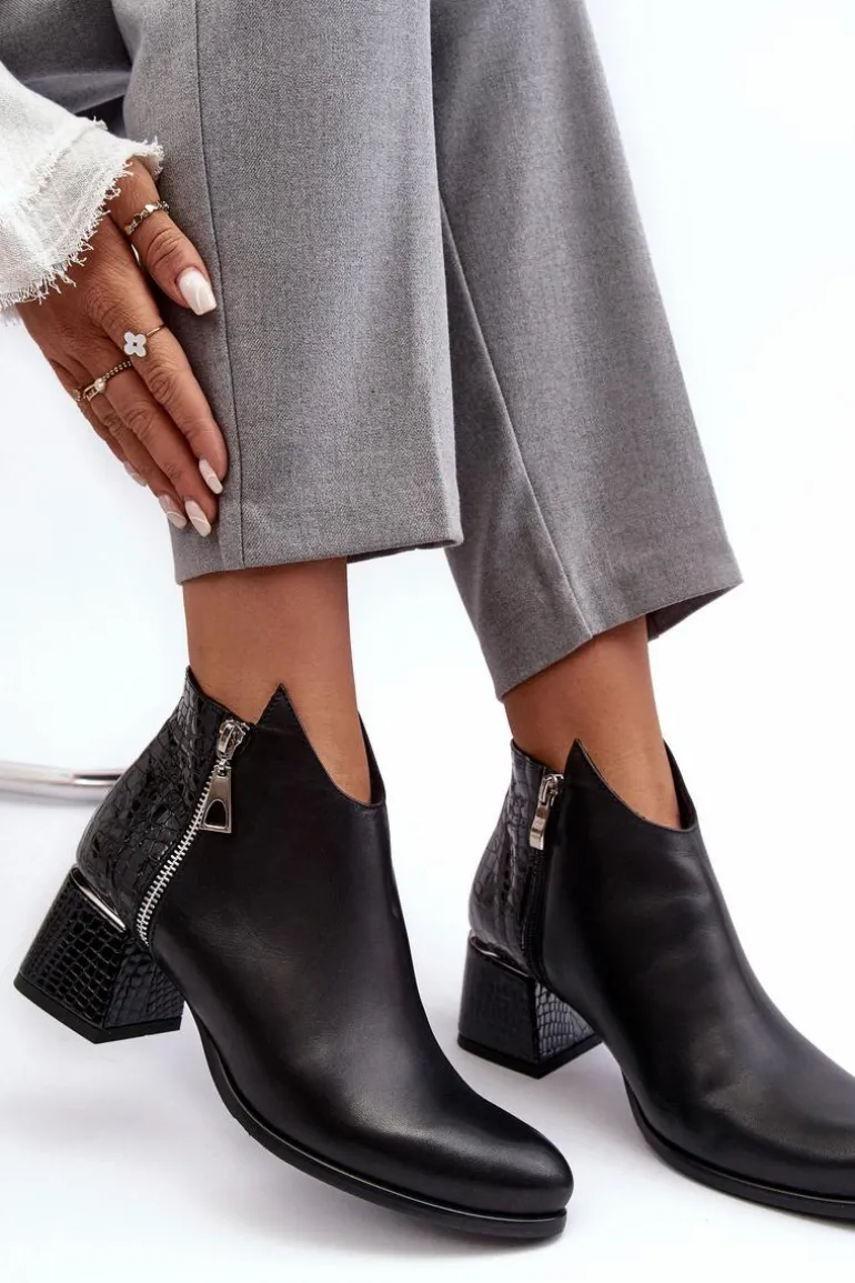 Rewelacyjne, damskie botki na obcasie w postaci niskiego słupka posiadają cholewkę za kostkę. Zostały wykonane z wysokiej jakości skóry naturalnej. Model ten jest zapinany na suwak. Dodatkowo posiada także ozdobny suwak po zewnętrznej stronie. Botki posiadają usztywniany zapiętek. Buty te zostały ocieplone kocem obuwniczym. Ten model świetnie sprawdzi się w wielu stylizacjach! Przy wyborze rozmiaru prosimy kierować się tabelą rozmiarów
