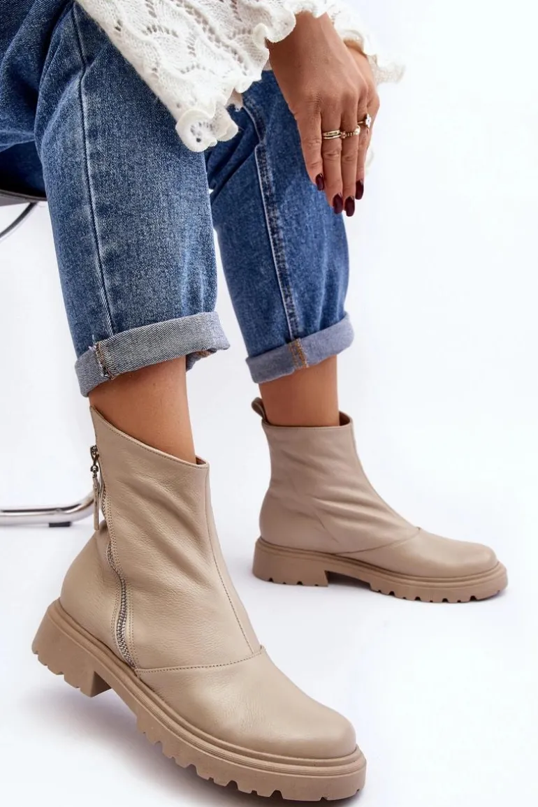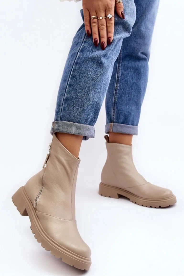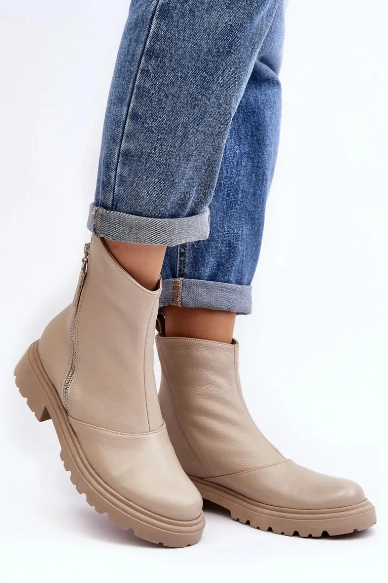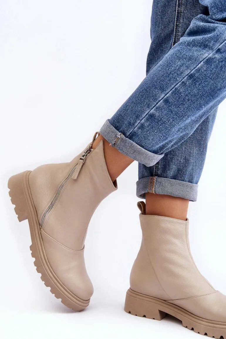 Damskie botki wykonane ze skóry naturalnej. Posiadają zamek z boku cholewki. Osadzone na płaskim obcasie ze żłobieniami. Środek ocieplony kocem obuwniczym. Noski zaokrąglone. Usztywniony zapiętek. Świetny model do wielu stylizacji! Musisz je mieć! Przy wyborze rozmiaru prosimy sugerować się tabelą rozmiarów.