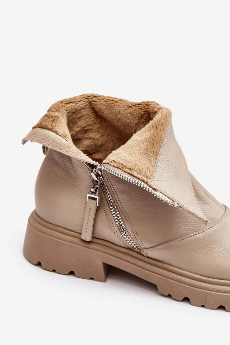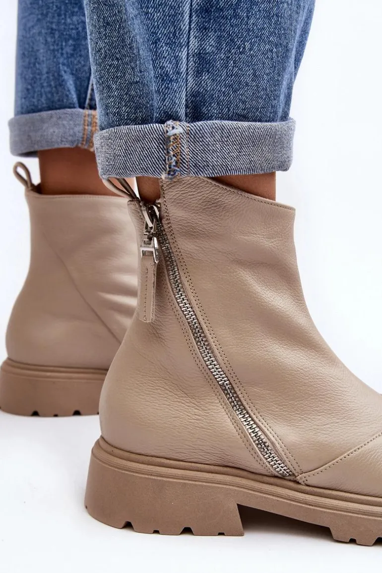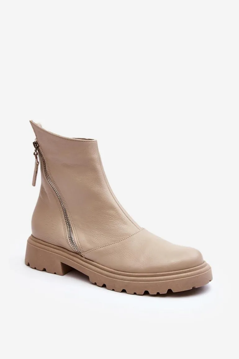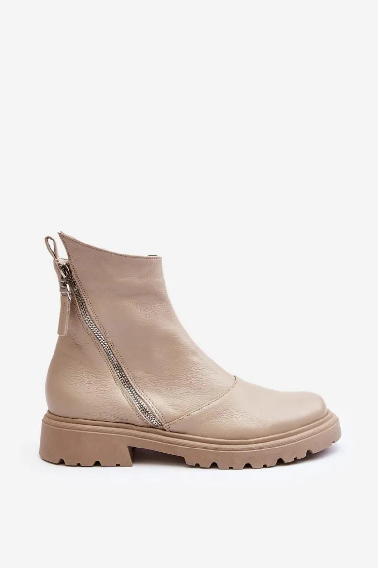 Damskie botki wykonane ze skóry naturalnej. Posiadają zamek z boku cholewki. Osadzone na płaskim obcasie ze żłobieniami. Środek ocieplony kocem obuwniczym. Noski zaokrąglone. Usztywniony zapiętek. Świetny model do wielu stylizacji! Musisz je mieć! Przy wyborze rozmiaru prosimy sugerować się tabelą rozmiarów.