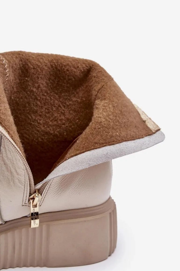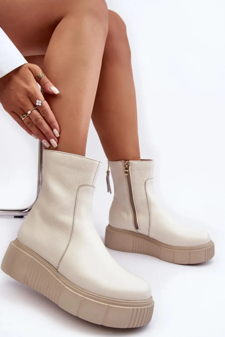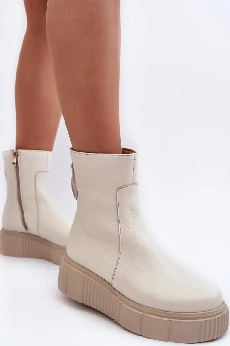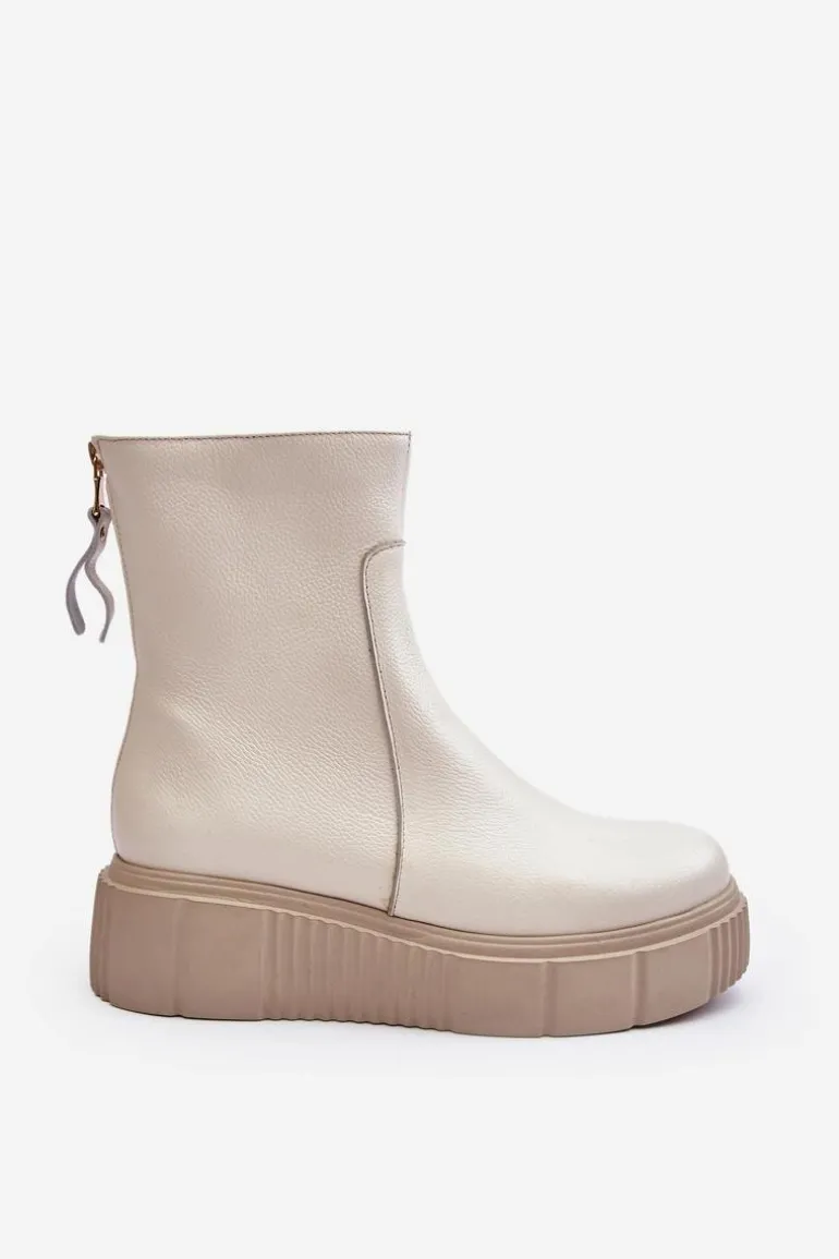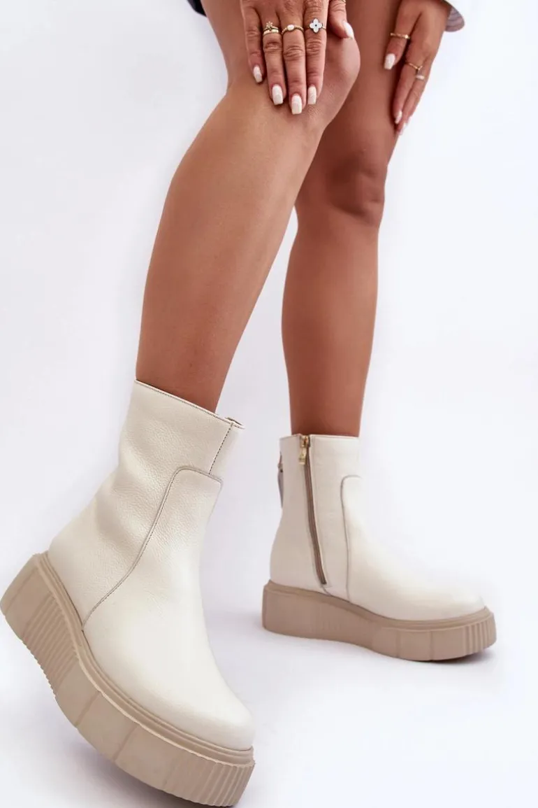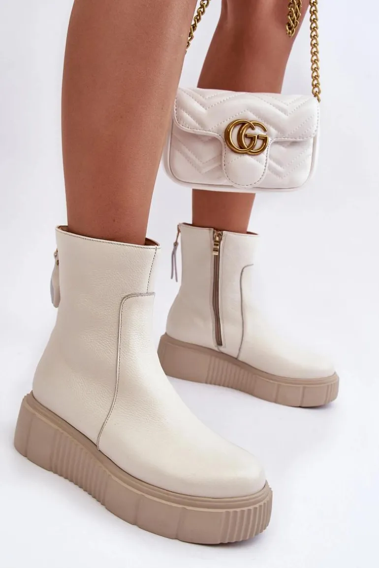 Botki damskie zostały wykonane z wysokiej jakości naturalnych skór. Osadzone na masywnej platformie z delikatnym koturnem. Zapinane z boku cholewki na suwak, natomiast suwak z tyłu jest ozdobny. Dodatkowo botki posiadają usztywniany zapiętek. Ocieplone w środku kocem obuwniczym. Model ten na pewno sprawdzi się w wielu jesiennych stylizacjach! Przy wyborze rozmiaru prosimy kierować się tabelą rozmiarów
