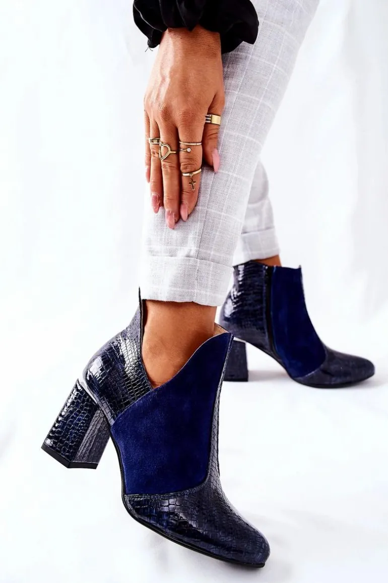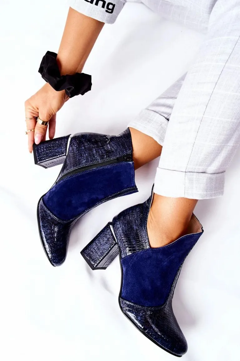 Damskie Skórzane Botki Na Słupku Granatowe I Wish
