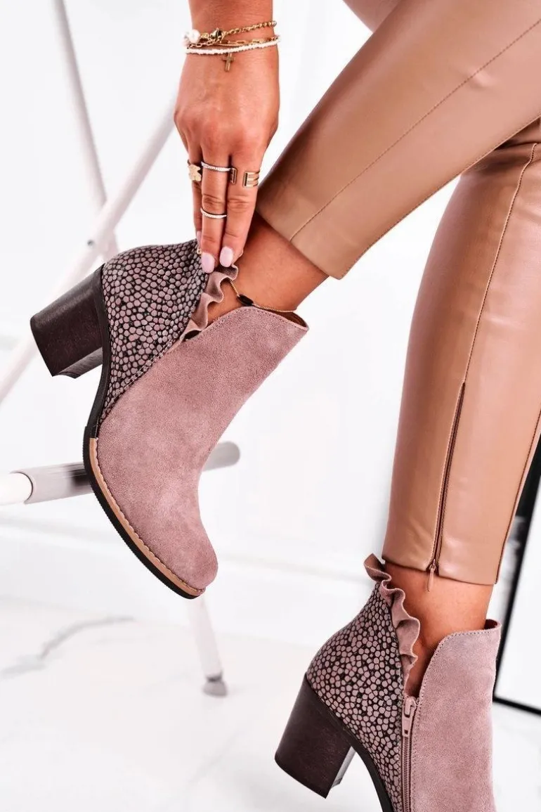 Przepiękne, modne, przyciągające wzrok! Takie są właśnie botki Maciejka. Wierzch wykonany z naturalnej skóry nubukowej. Zdobiona zwierzęcym motywem cholewka w połączeniu z falbanką tworzy niesamowite zestawienie. Stabilny obcas uniesie i wyeksponuje Twoją sylwetkę. Miękka skórzana wkładka zadba o komfort na każdym kroku. Przy wyborze rozmiaru prosimy sugerować się tabelą rozmiarów.