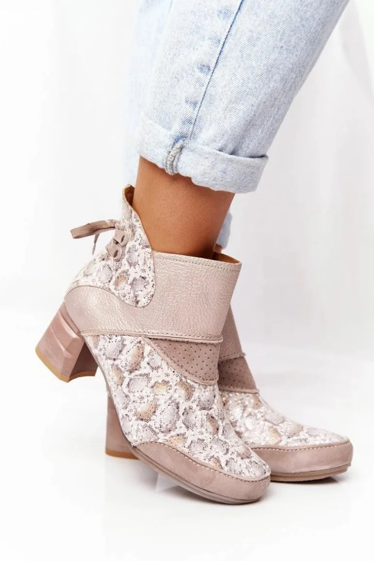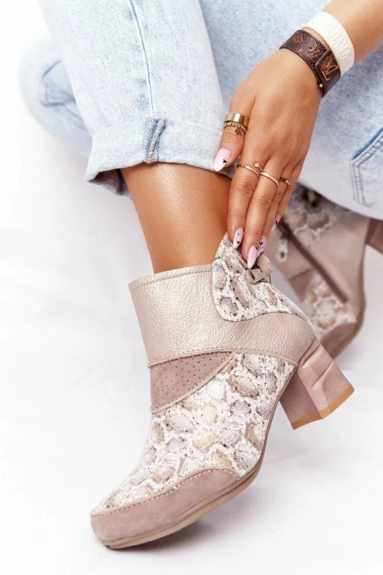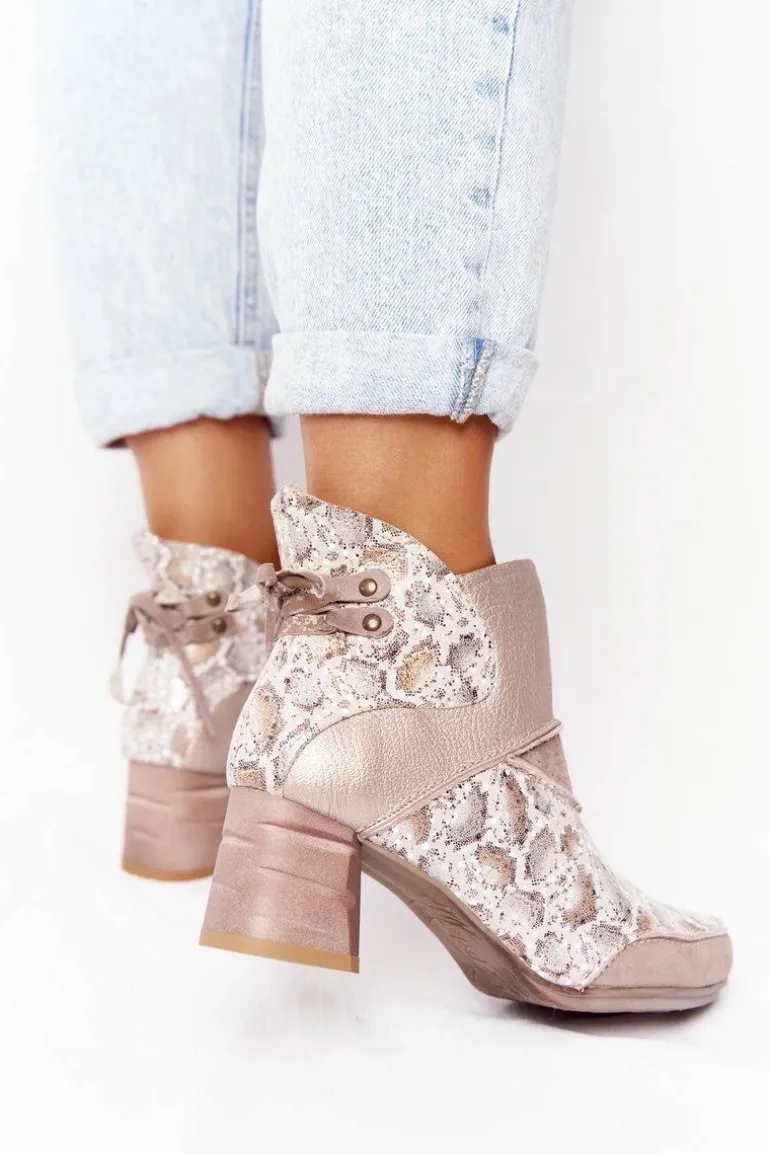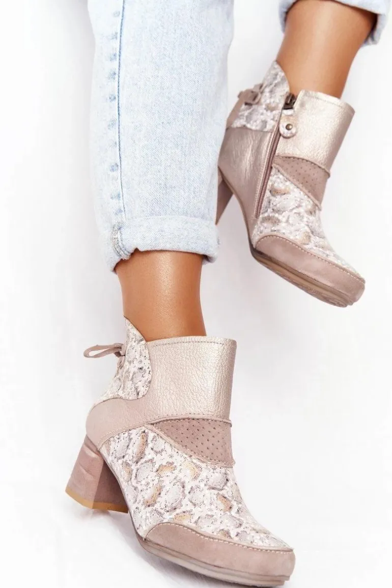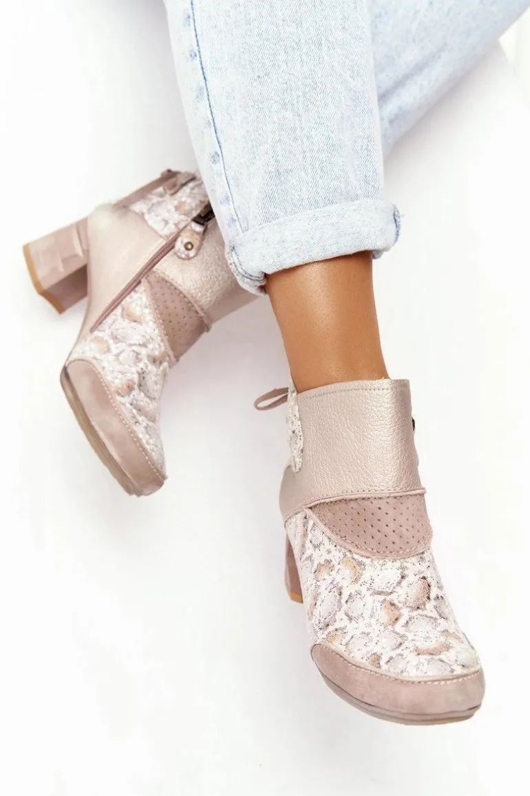 Damskie Skórzane Botki Na Słupku Maciejka Złoto Beżowe 03963-20