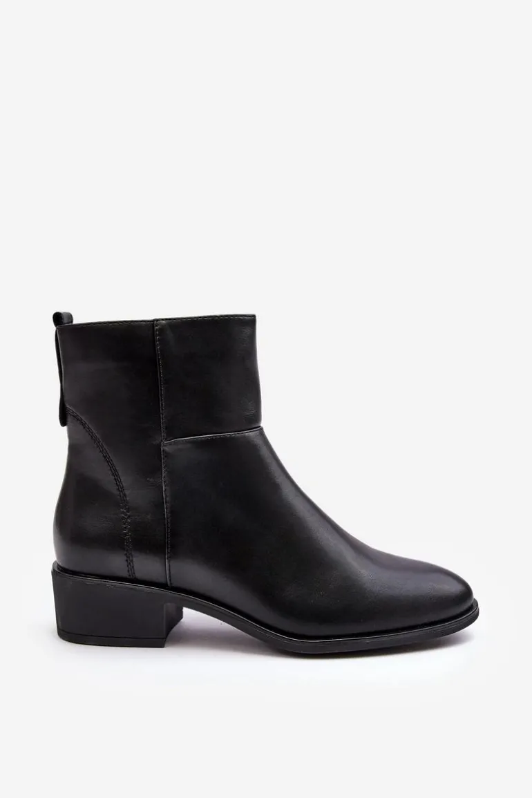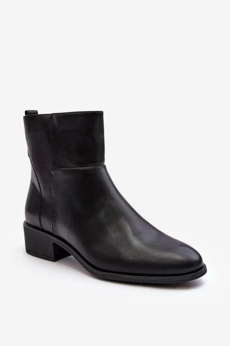Klasyczne damskie botki osadzone na płaskim obcasie. Wykonane z eko skóry. Cholewka ozdobiona przeszyciami. Model ten zapinany jest na suwak z boku. Noski zaokrąglone. Środek ocieplony kocem obuwniczym. Usztywniony zapiętek. Idealne do wielu stylizacji! Koniecznie sprawdź także pozostałe modele botków dostępnych w naszej ofercie. Przy wyborze rozmiaru prosimy sugerować się tabelą rozmiarów.