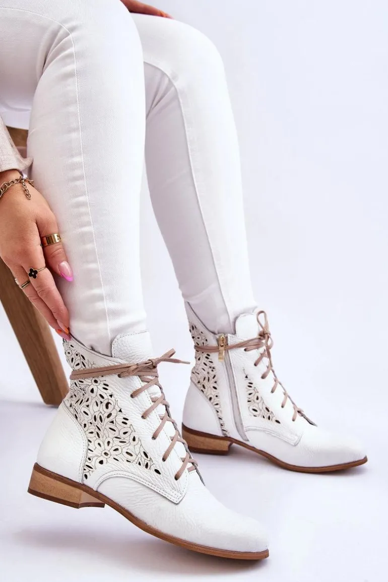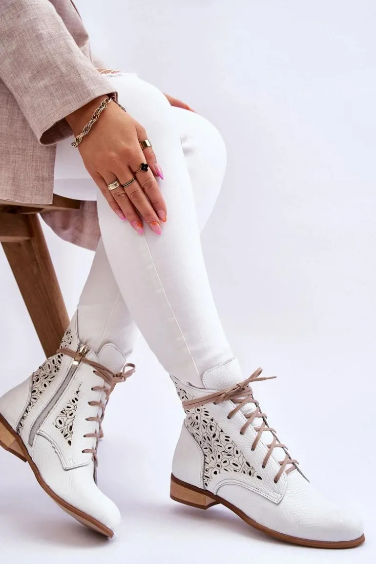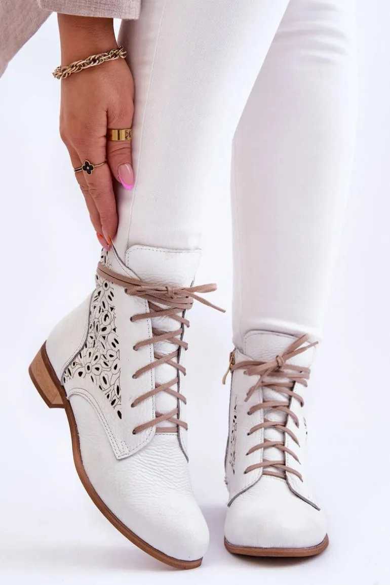 Niezwykle wygodne botki damskie zostały wykonane z wysokiej jakości naturalnej skóry. Dodatkowo ozdobiono je ażurowym wzorkiem. Zapinane z boku cholewki na suwak oraz sznurowane. Dodatkowo botki posiadają usztywniany zapiętek oraz miękką, skórzaną wkładkę. Osadzone na płaskim obcasie, co sprawia, że są niezwykle stabilne. Przy wyborze rozmiaru prosimy sugerować się tabelą rozmiarów.