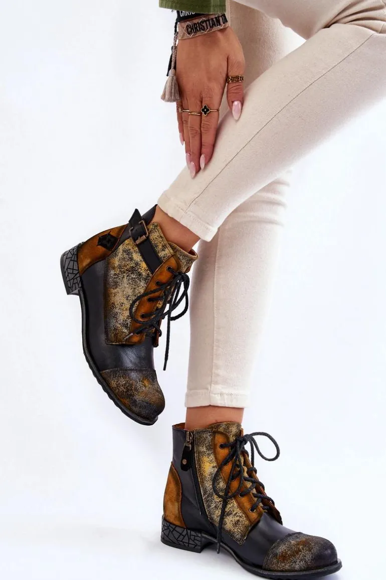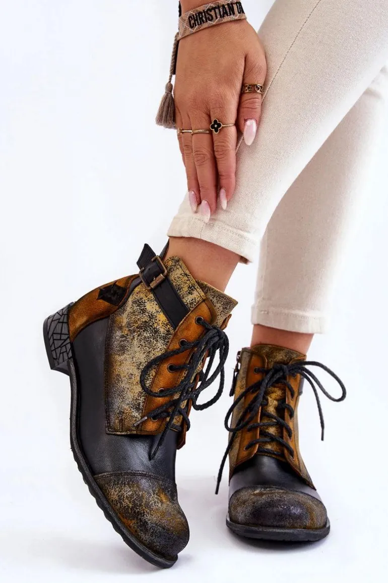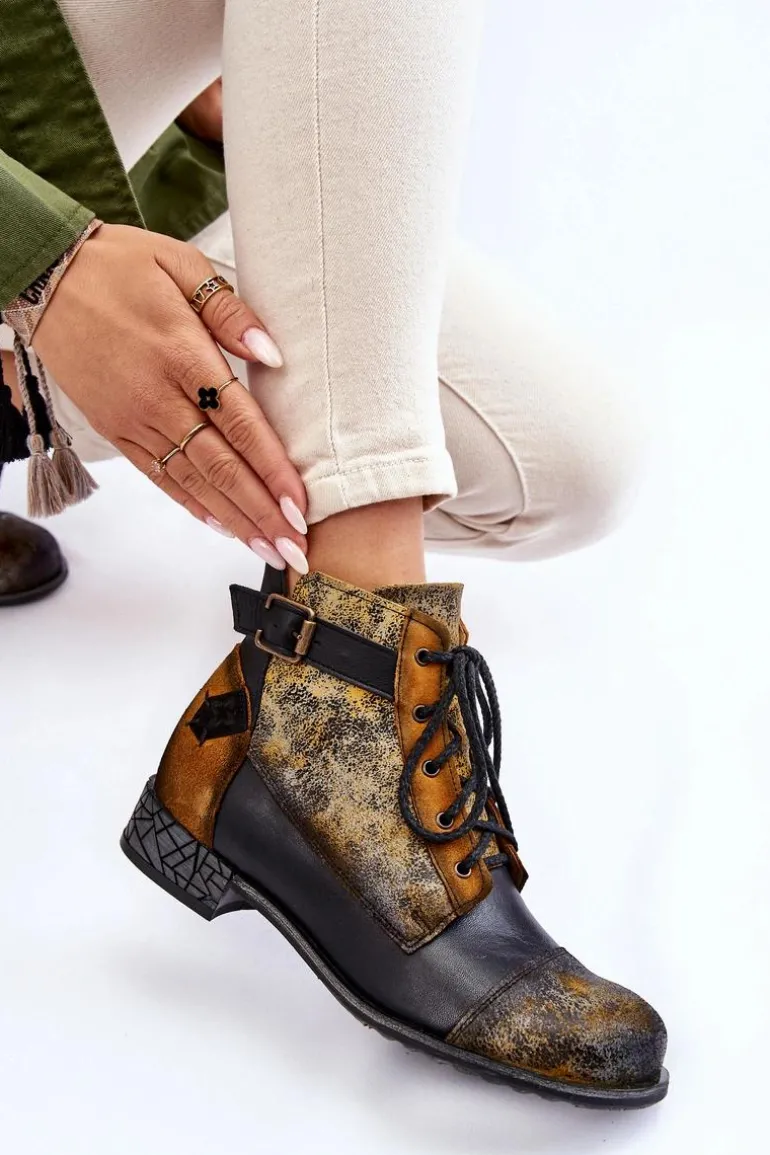 Damskie trzewiki zostały wykonane z naturalnych skór wysokiej jakości. Model ten posiada solidne sznurowanie oraz suwak z boku cholewki. Botki zostały ozdobione paskiem z klamrą. Trzewiki osadzono na płaskim obcasie. Botki nie posiadają ocieplenia. Dodatkowo zapiętek jest usztywniany. Koniecznie powinnaś je mieć! Przy wyborze rozmiaru prosimy sugerować się tabelą rozmiarów.