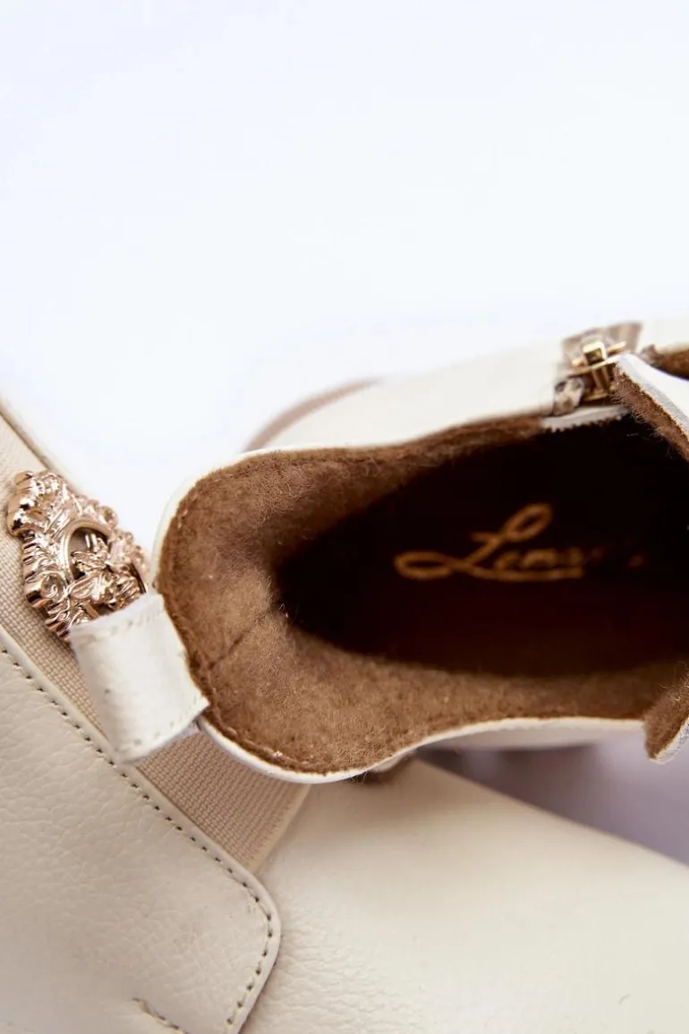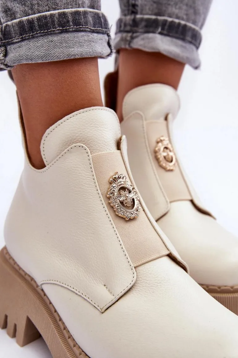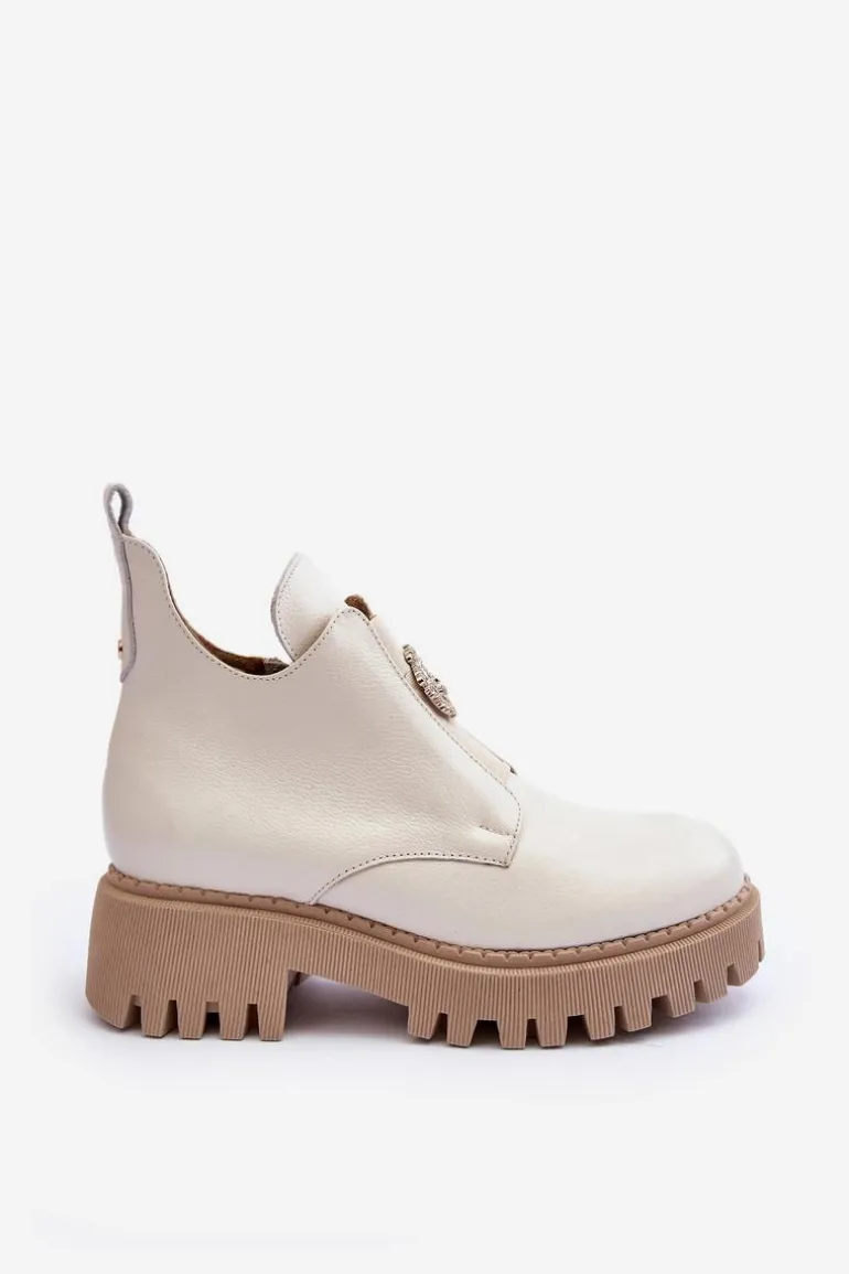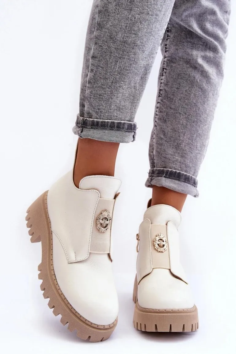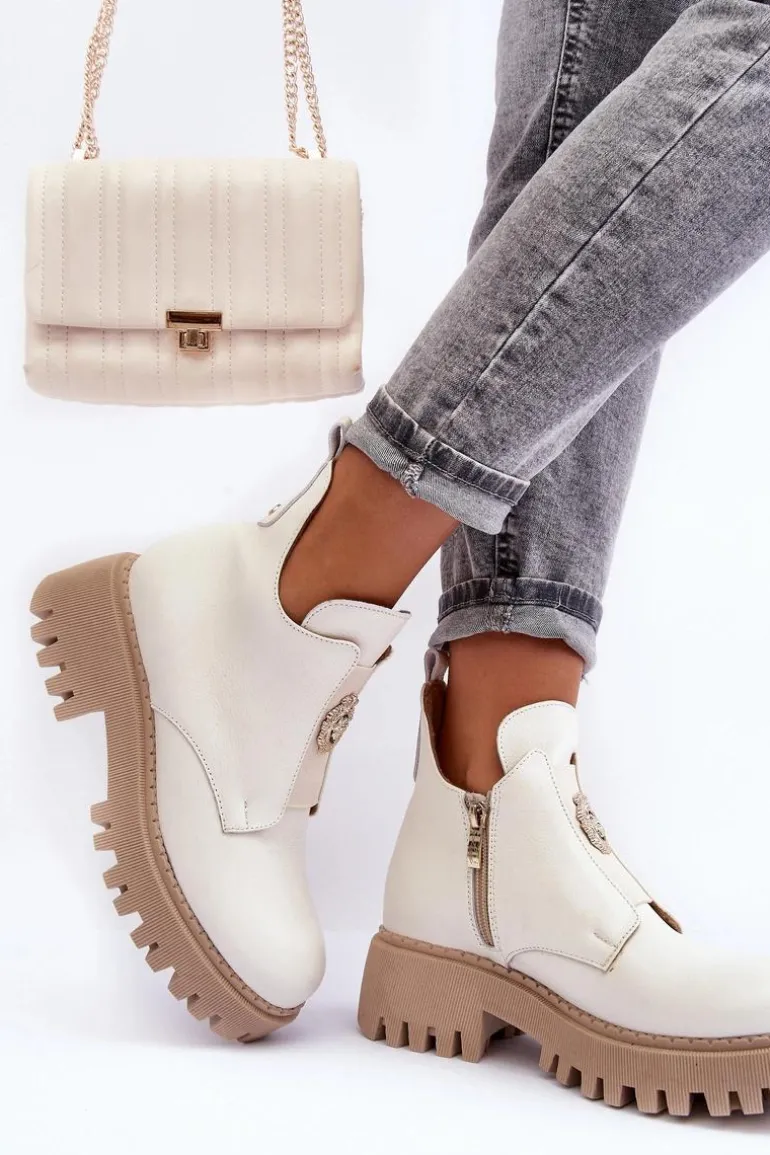 Damskie botki zostały wykonane z wysokiej jakości naturalnej skóry. Osadzone na masywnym obcasie i platformie ze żłobieniami. Model zapinany na suwak po wewnętrznej stronie cholewki. Z przodu na elastycznej wstawce znajduje się ozdoba z tworzywa sztucznego. Wnętrze ocieplone kocem obuwniczym. Ten wyjątkowy model wzbogaci wiele Twoich stylizacji! Przy wyborze rozmiaru prosimy sugerować się tabelą rozmiarów.