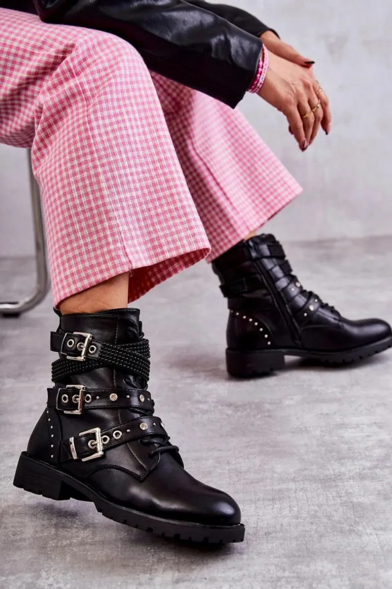 Modne damskie botki zostały wykonane z wierzchu z eko skóry. Na cholewce znajdują się paski z ozdobami w postaci ćwieków. Dodatkowo są one regulowane i posiadają klamry. Model ten jest zapinany na zamek błyskawiczny oraz sznurowany. Wnętrze botków jest pokryte miękkim kocem obuwniczym. Delikatna platforma oraz płaski obcas zapewnią stabilność na każdym kroku. Przy wyborze rozmiaru prosimy sugerować się tabelą rozmiarów.