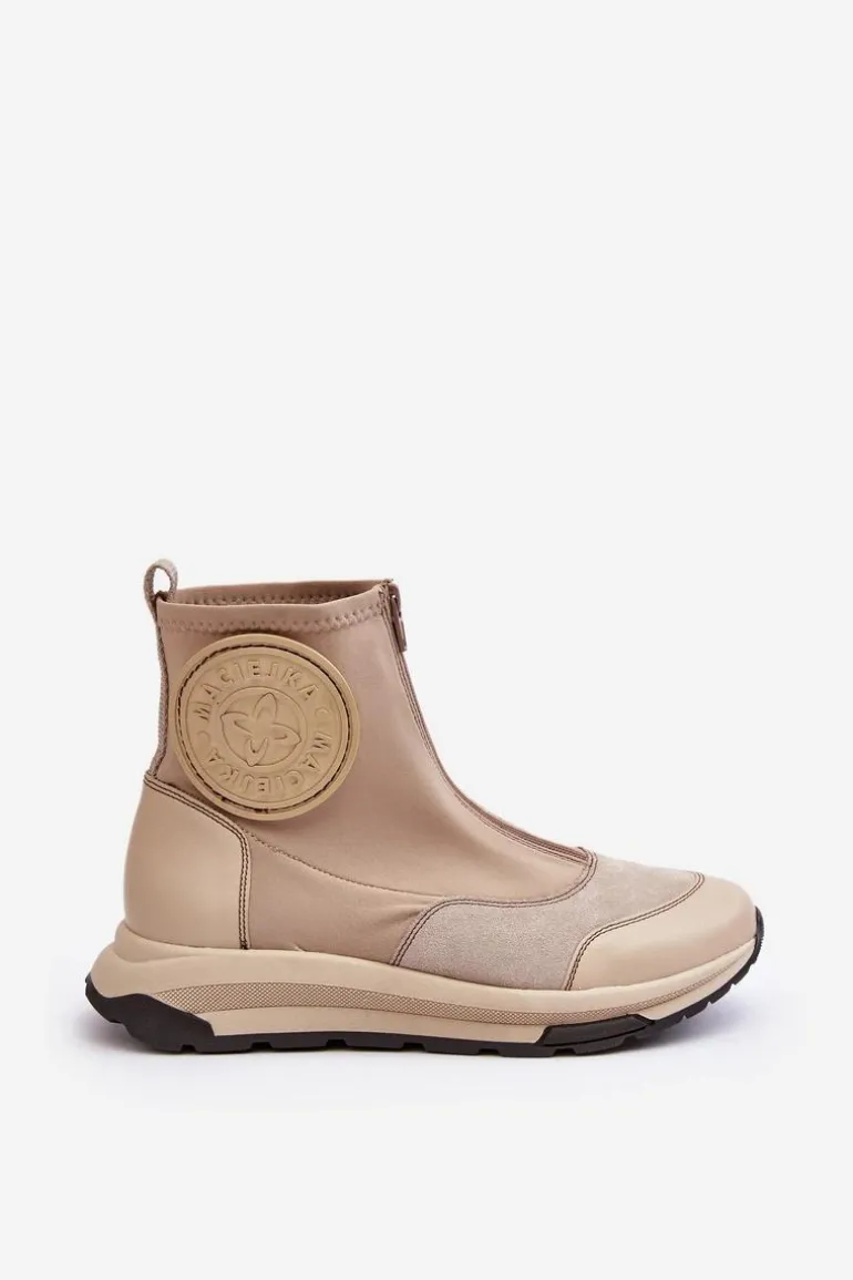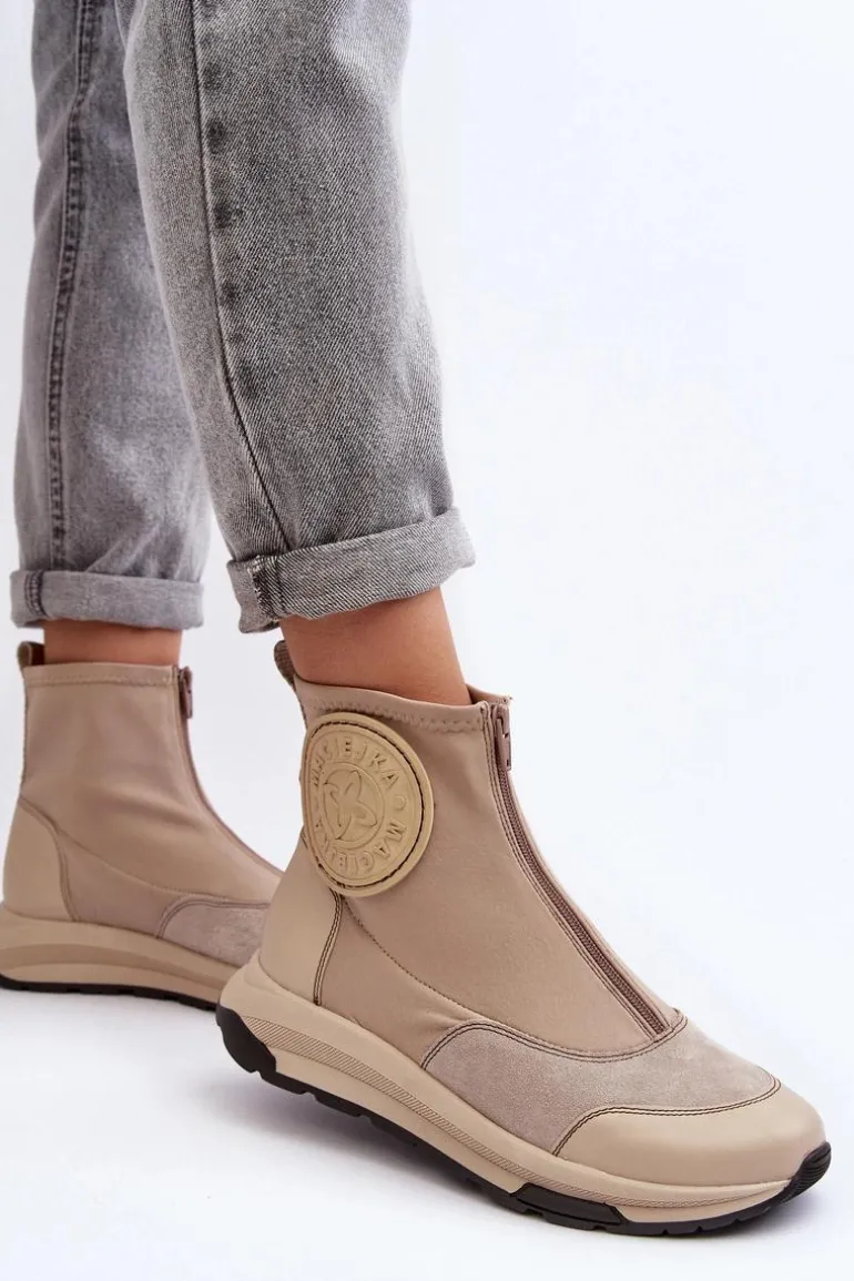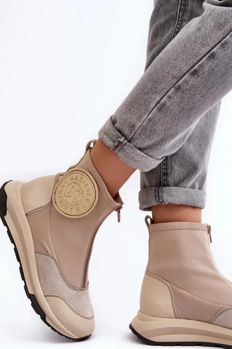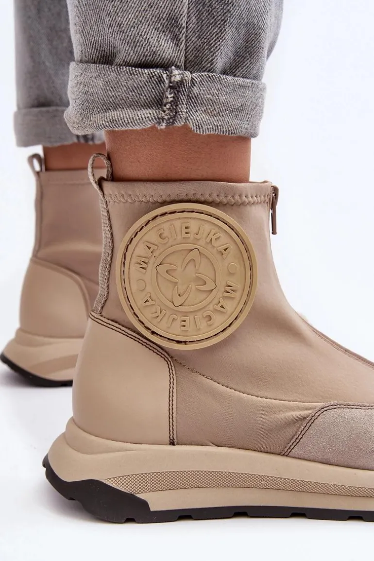 Botki damskie w sportowym stylu marki Maciejka. Wykonane z połączenia najwyższej jakości skóry naturalnej i tkaniny. Z boku cholewki duże logo marki. Model ten zapinany jest na suwak z przodu. Noski zaokrąglone. Usztywniony zapiętek. Przy wyborze rozmiaru prosimy sugerować się tabelą rozmiarów.