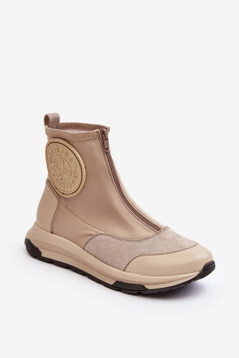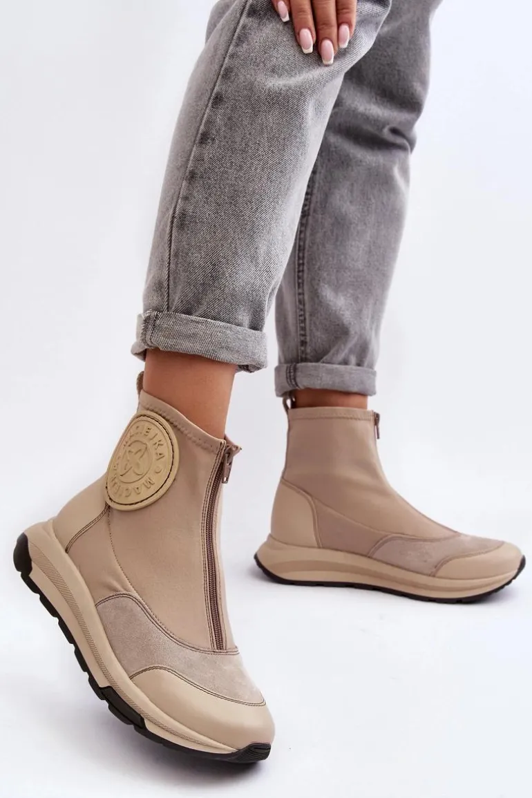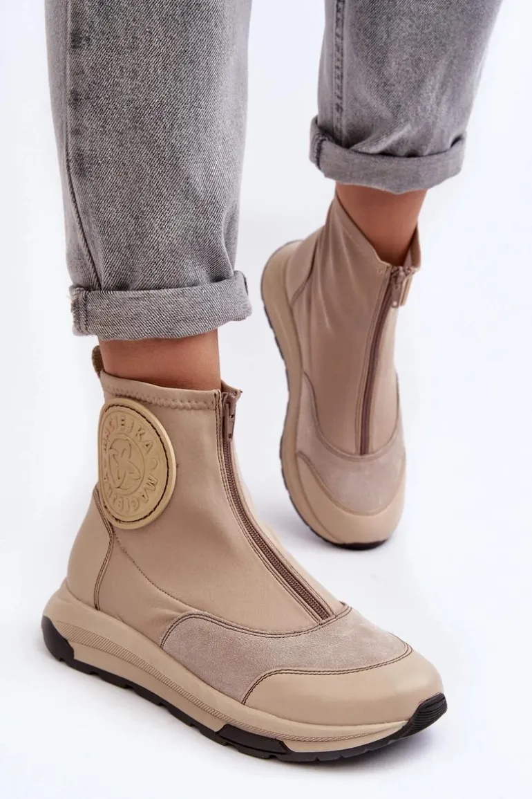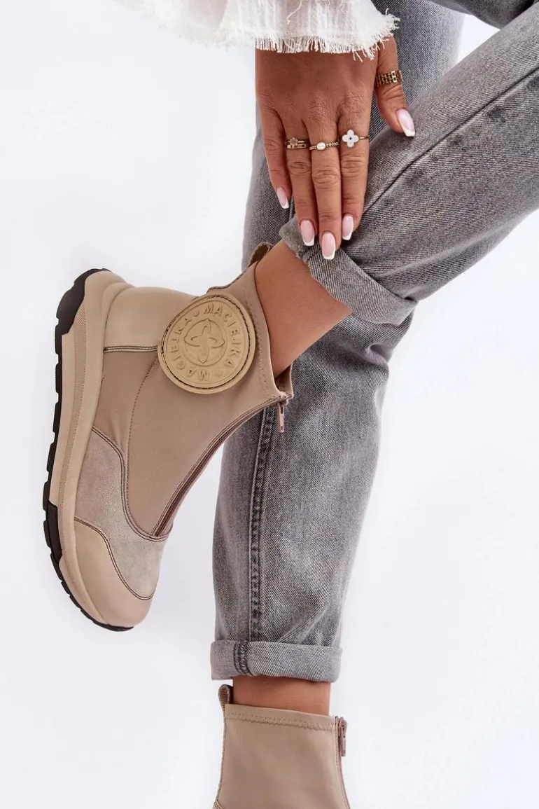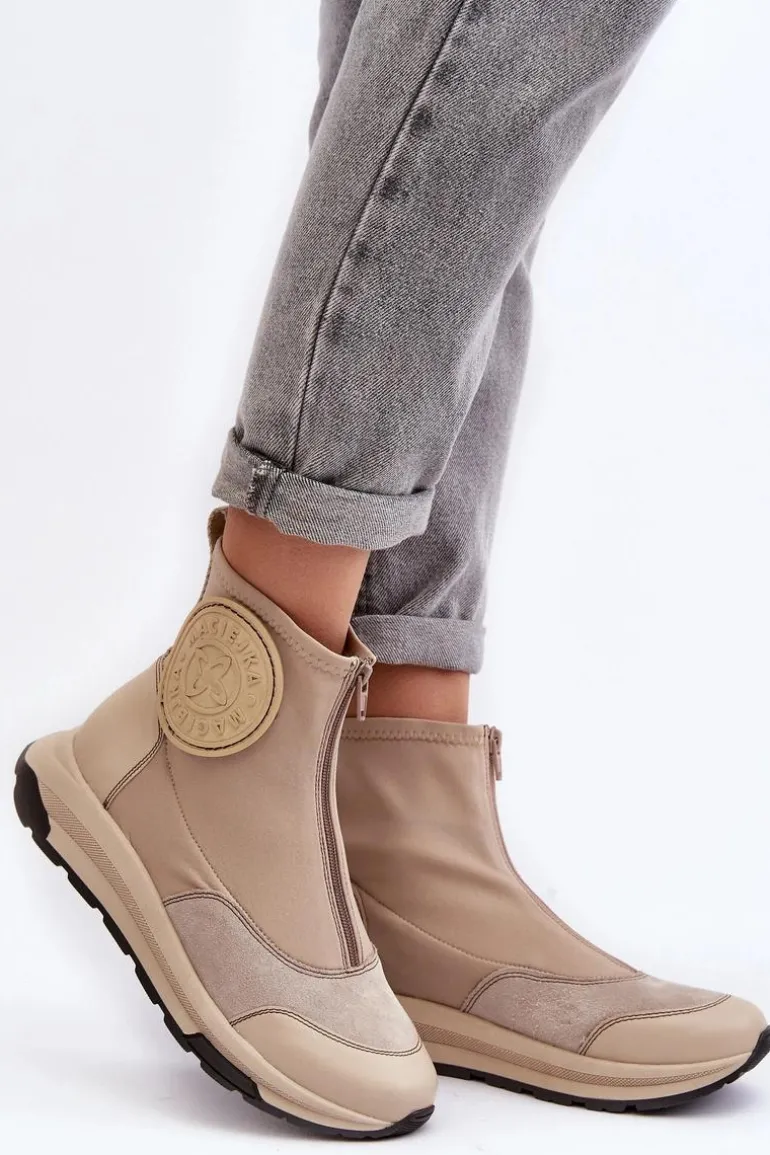 Botki damskie w sportowym stylu marki Maciejka. Wykonane z połączenia najwyższej jakości skóry naturalnej i tkaniny. Z boku cholewki duże logo marki. Model ten zapinany jest na suwak z przodu. Noski zaokrąglone. Usztywniony zapiętek. Przy wyborze rozmiaru prosimy sugerować się tabelą rozmiarów.