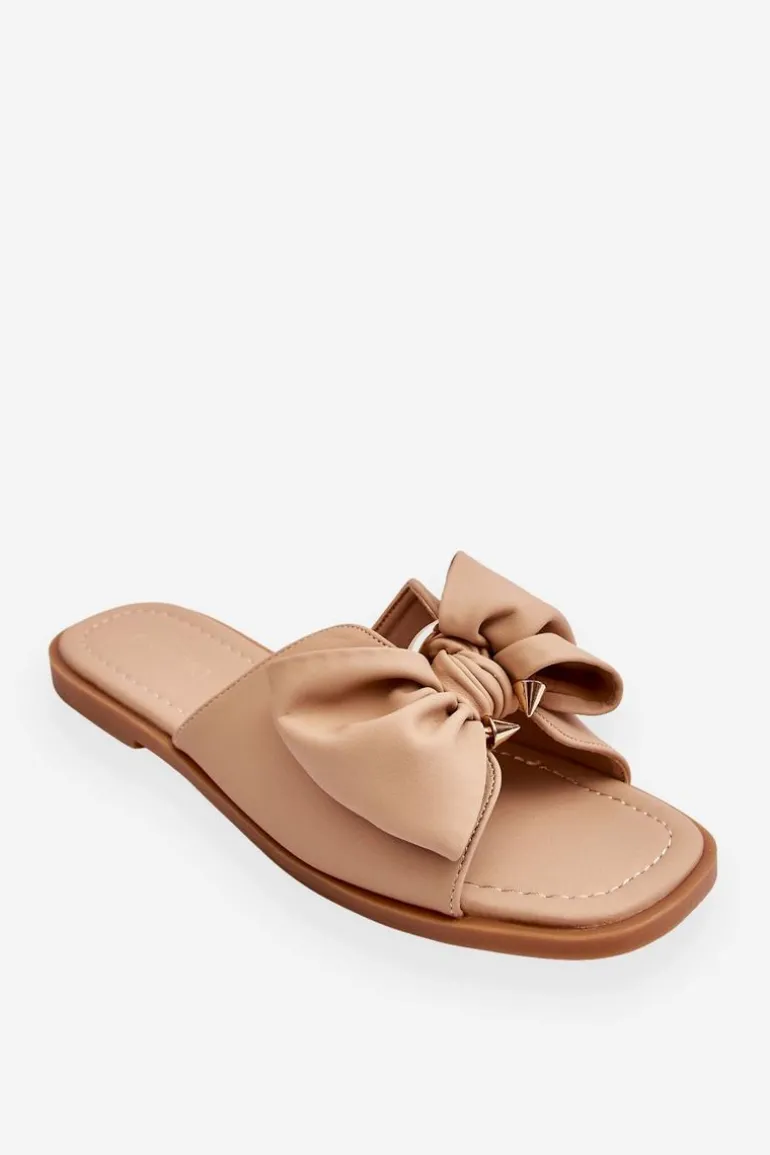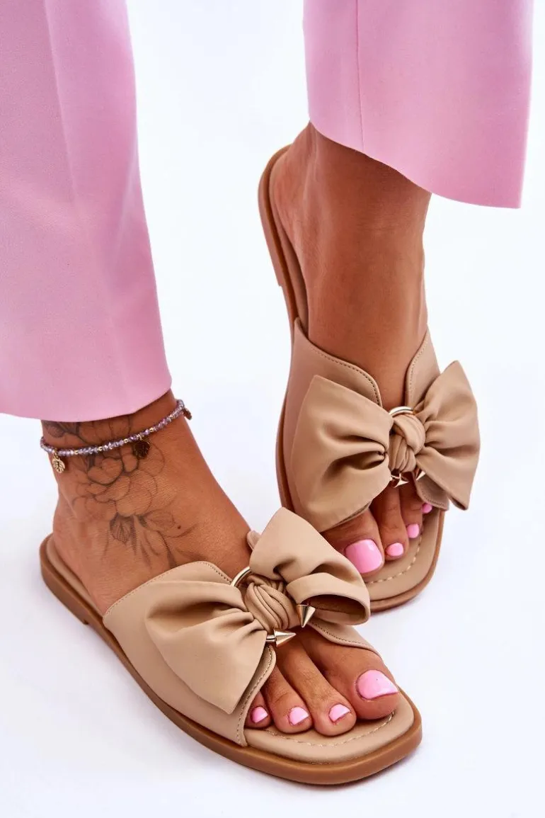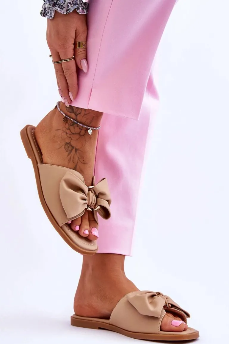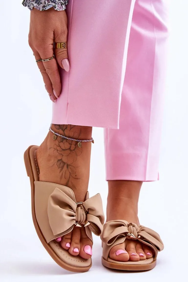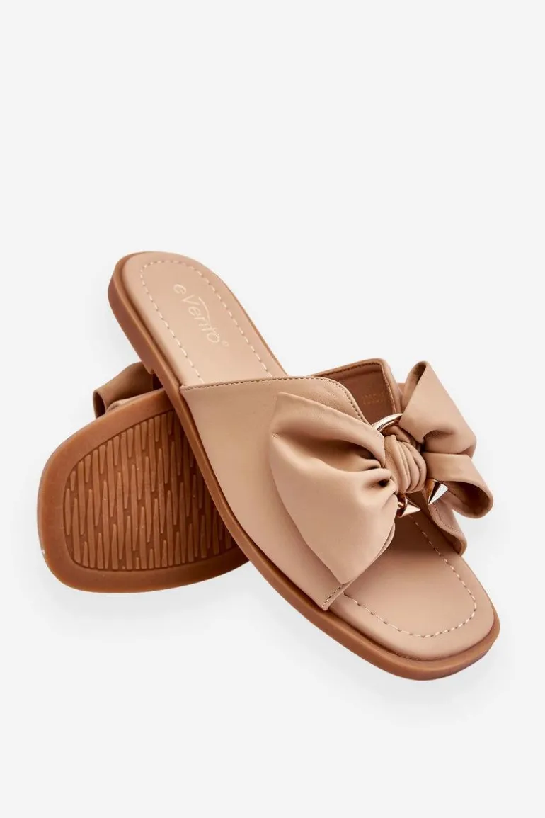Damskie klapki o klasycznym fasonie. Wykonane z eko skóry. Modna kokarda z ozdobą na przodzie sprawia, że klapki wyglądają niesamowicie! Miękka wkładka jest wygodna w użytkowaniu i została także wykonana z eko skóry. Nosek odkryty, kwadratowy. Klapki zostały osadzone na płaskim obcasie. Modne i komfortowe w użytkowaniu — po prostu musisz je mieć. Przy wyborze rozmiaru prosimy sugerować się tabelą rozmiarów.