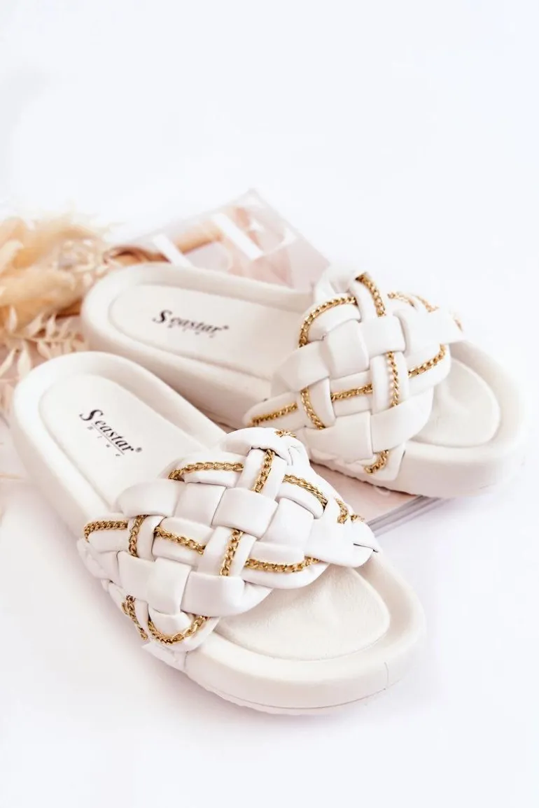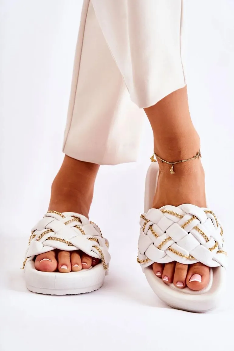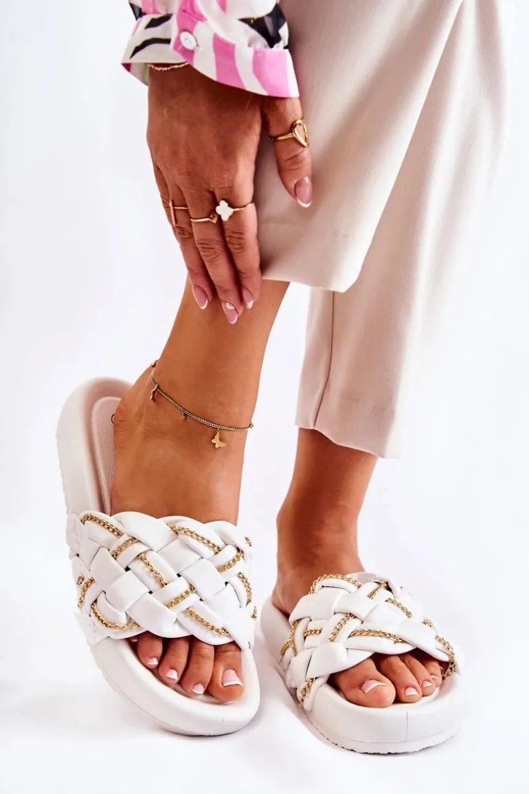 Modne klapki wykonane z eko skóry. Posiadają pleciony pasek z ozdobnym, delikatnym łańcuszkiem. Osadzone na platformie. Wkładka wykonana z gumowego tworzywa. Nosek odkryty, zaokrąglony. Model, który świetnie wpasuje się w letnie klimaty! Koniecznie powinnaś je mieć! Fason ten będzie pasować do wielu stylizacji. Model klasyczny, wsuwany. Przy wyborze rozmiaru prosimy sugerować się tabelą rozmiarów.