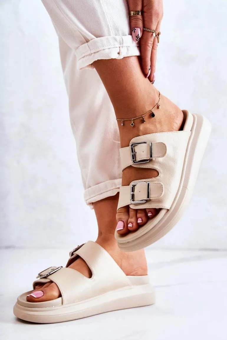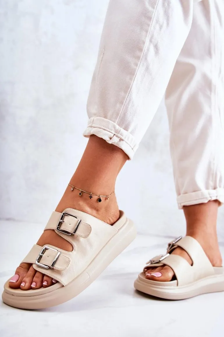 Świetne, modne klapki wykonane z wysokiej jakości eko skóry. Model wsuwany. Z przodu dwa, złączone ze sobą paski, z wycięciem na środku, które są regulowane i zapinane na sprzączki. Osadzone na masywnej platformie wykonanej ze sztucznego tworzywa. Klapki posiadają profilowaną, wygodną wkładkę. Utrzymane w jednolitej kolorystyce, dzięki której stworzysz wiele letnich stylizacji. Przy wyborze rozmiaru prosimy kierować się tabelą rozmiarów.