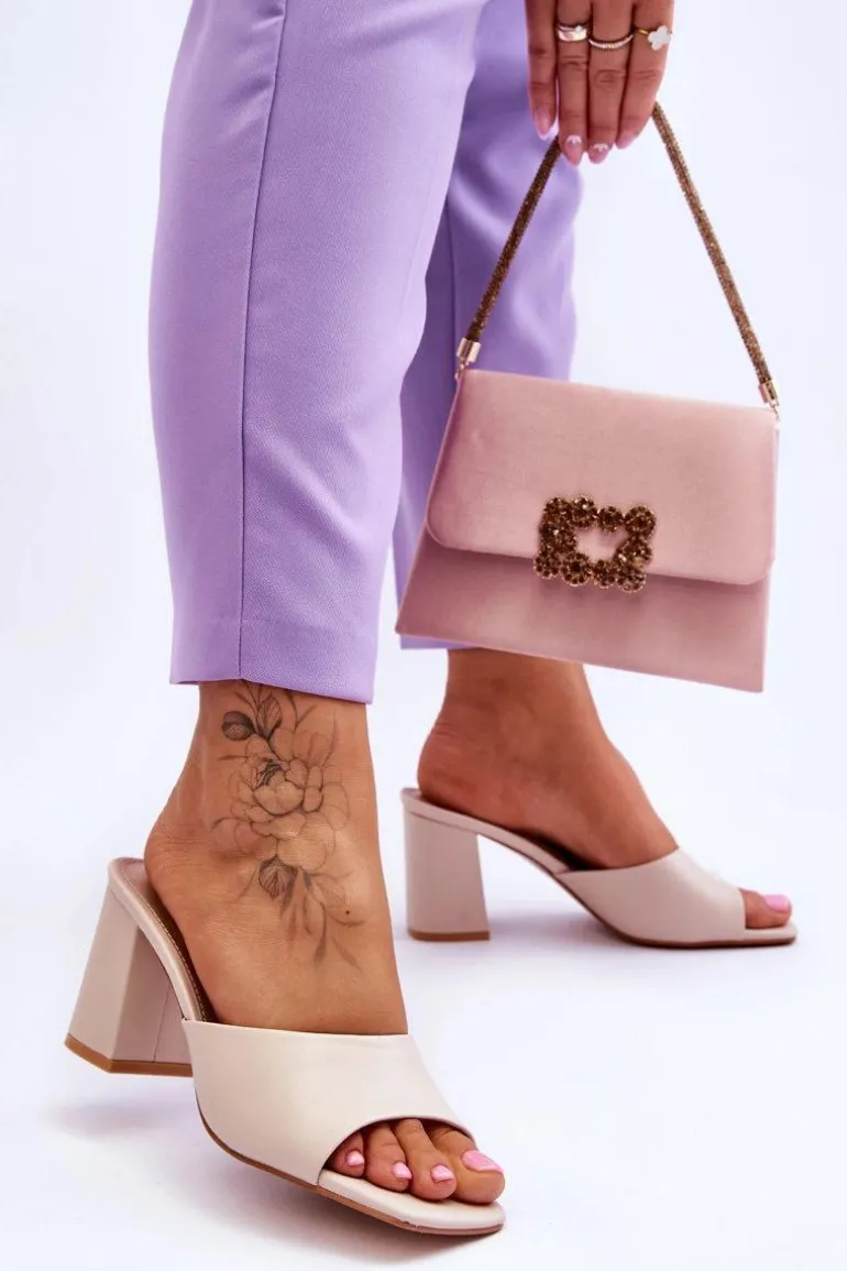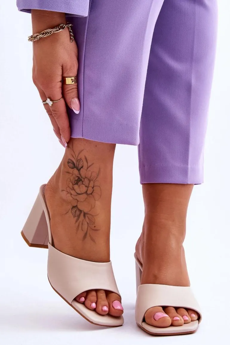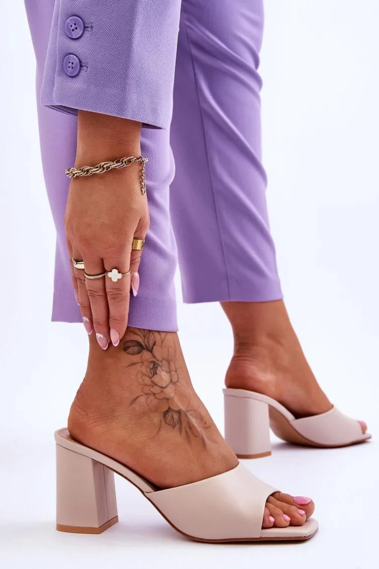 Damskie klapki o klasycznym fasonie. Model ten został wykonany z eko skóry. Klapki posiadają otwarty, kwadratowy nosek. Wkładka jest wygodna i wykonana z eko skóry. Klapki osadzono na obcasie w postaci słupka. Idealne do wielu stylizacji w upalne dni! Przy wyborze rozmiaru prosimy sugerować się tabelą rozmiarów.