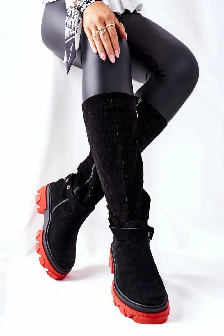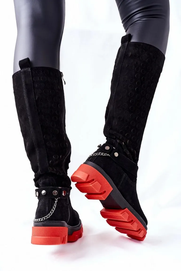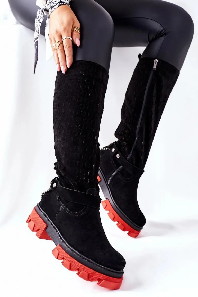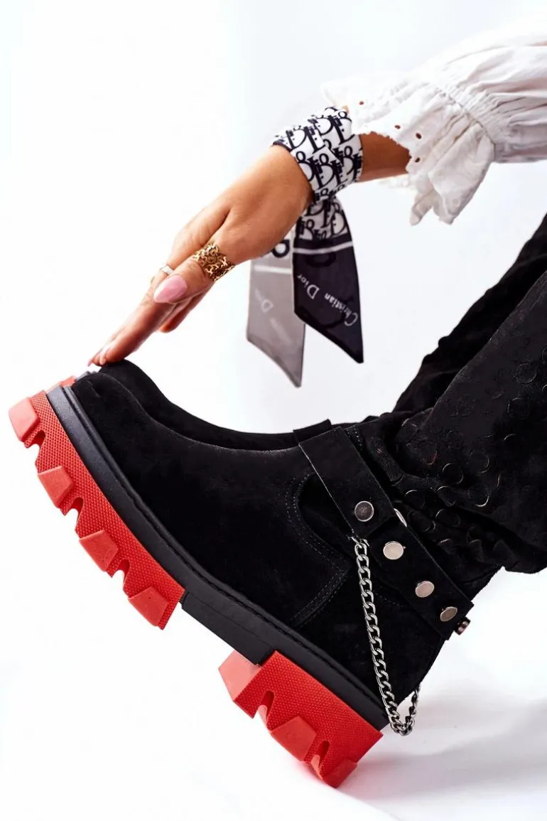 Niesamowite kozaki, które koniecznie muszą znaleźć się w szafie kobiety tak wyjątkowej jak Ty! Gruba platformowa podeszwa, zdobienia z łańcucha oraz pasek z nitami to podkreśla ich niesamowity, mocny charakter! Możliwość odpięcia zdobienia. Buty w całości wykonane z naturalnego zamszu. Zakładanie ułatwi wszyty na boku suwak. Przy wyborze rozmiaru, prosimy sugerować się tabelą rozmiarów.