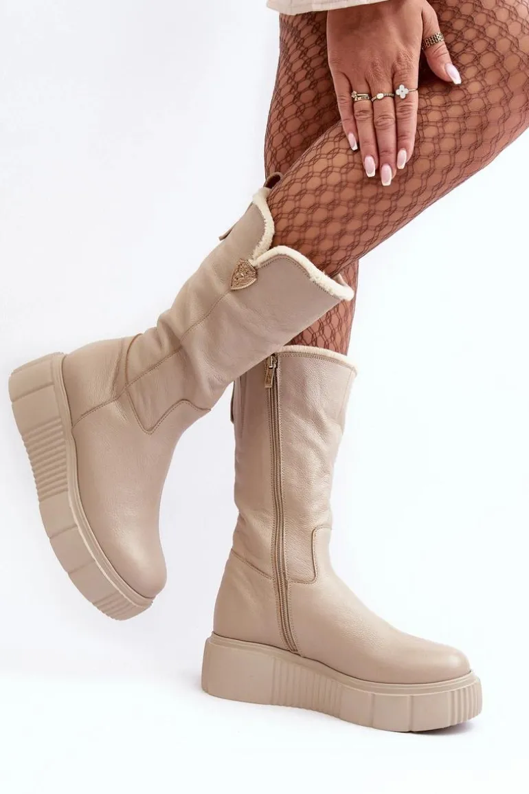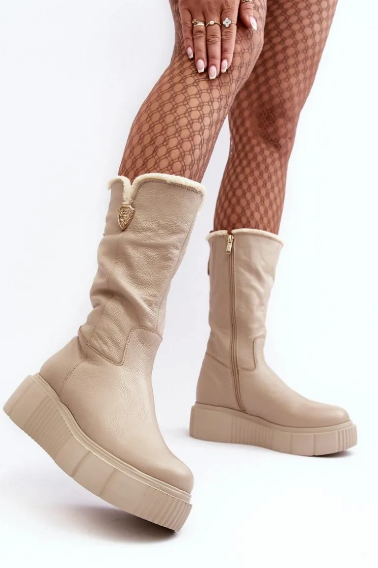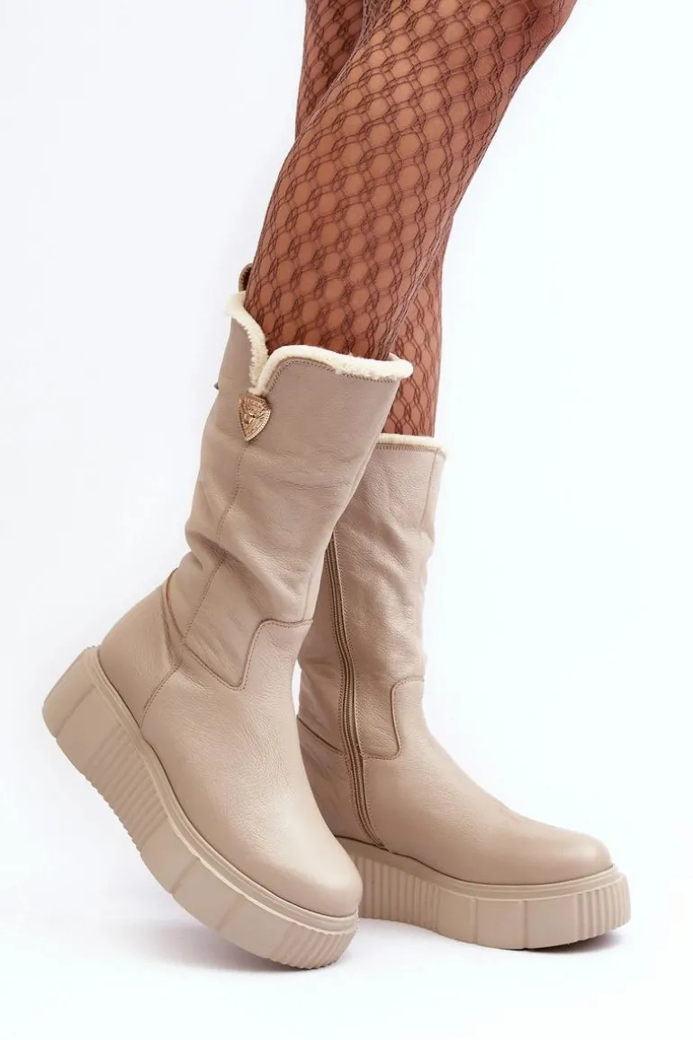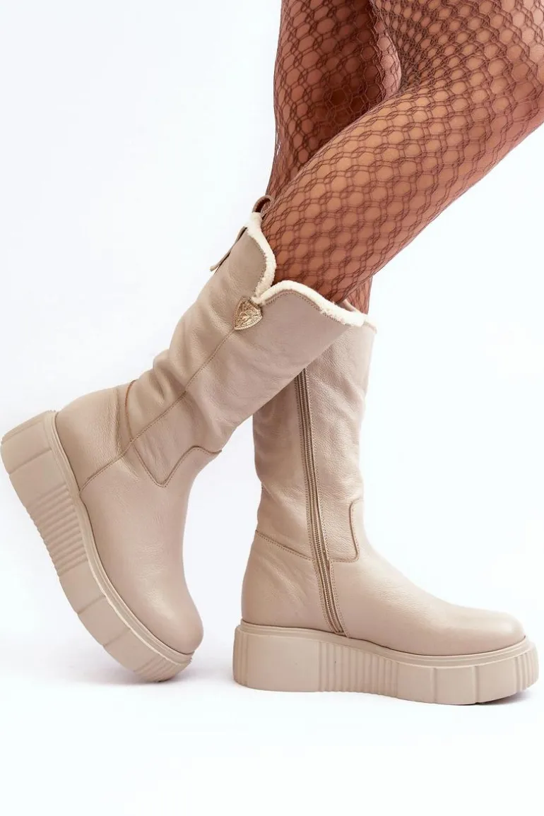 Damskie kozaki zostały wykonane z naturalnej skóry. Model ten posiada suwak z boku cholewki. Wnętrze zostało ocieplone naturalną wełną. Zapiętek jest usztywniany. Kozaki osadzono na masywnej platformie oraz koturnie. Posiadają ozdobny element z boku cholewki. Ten model świetnie sprawdzi się podczas chłodnych, zimowych dni. Przy wyborze rozmiaru prosimy sugerować się tabelą rozmiarów.
