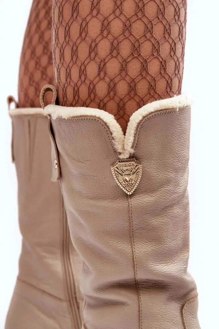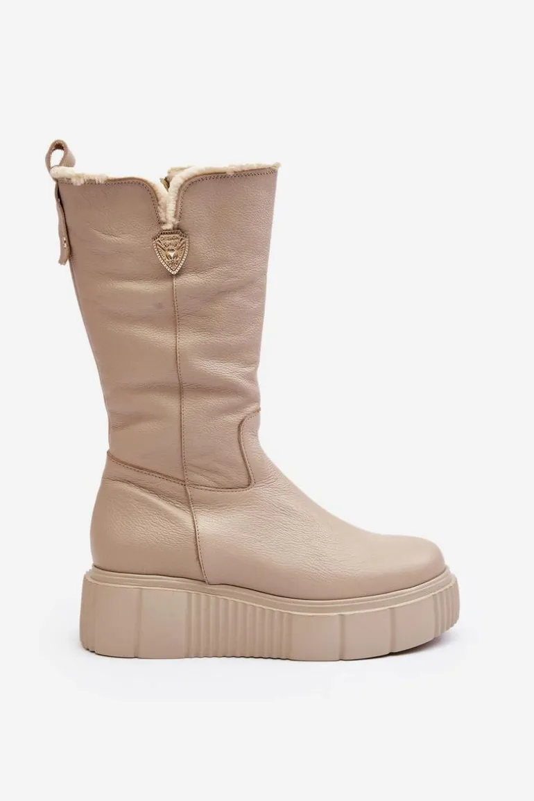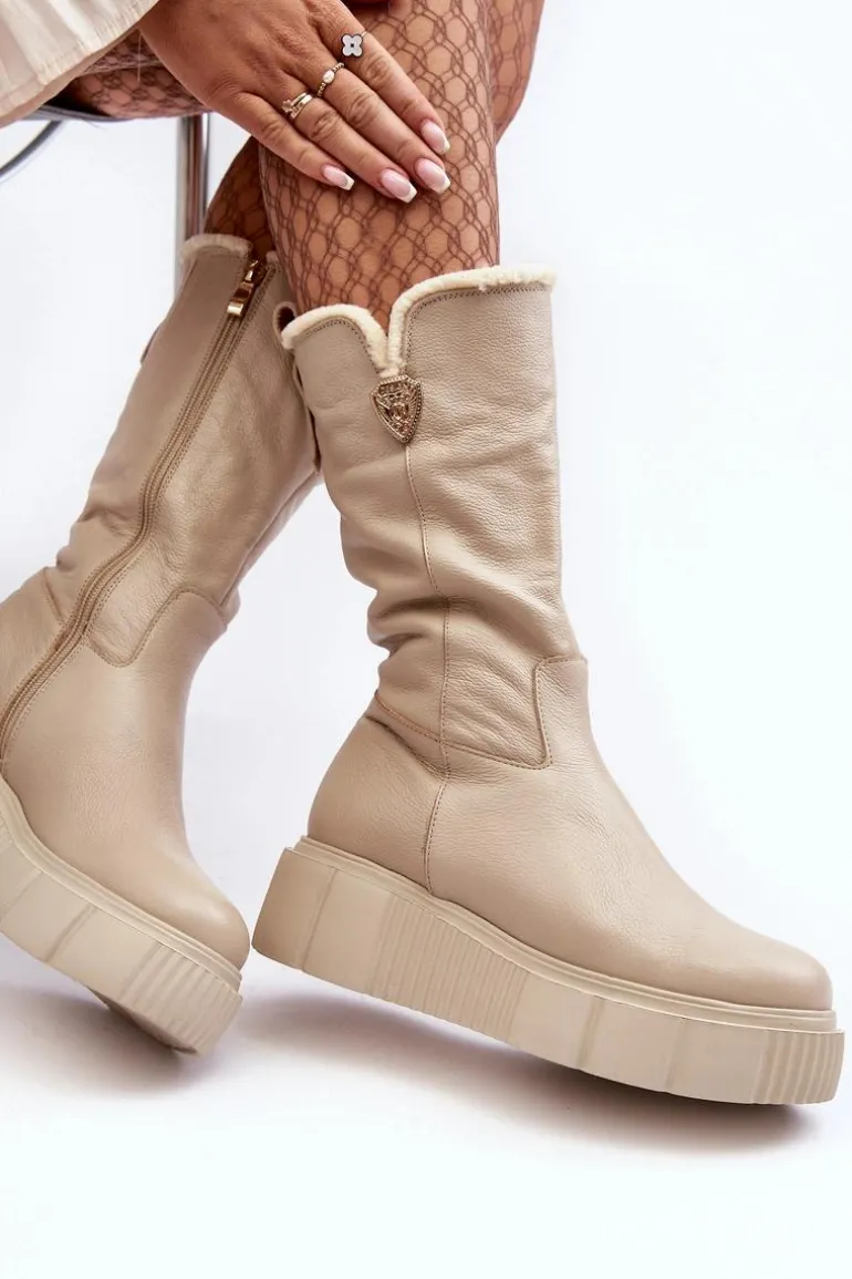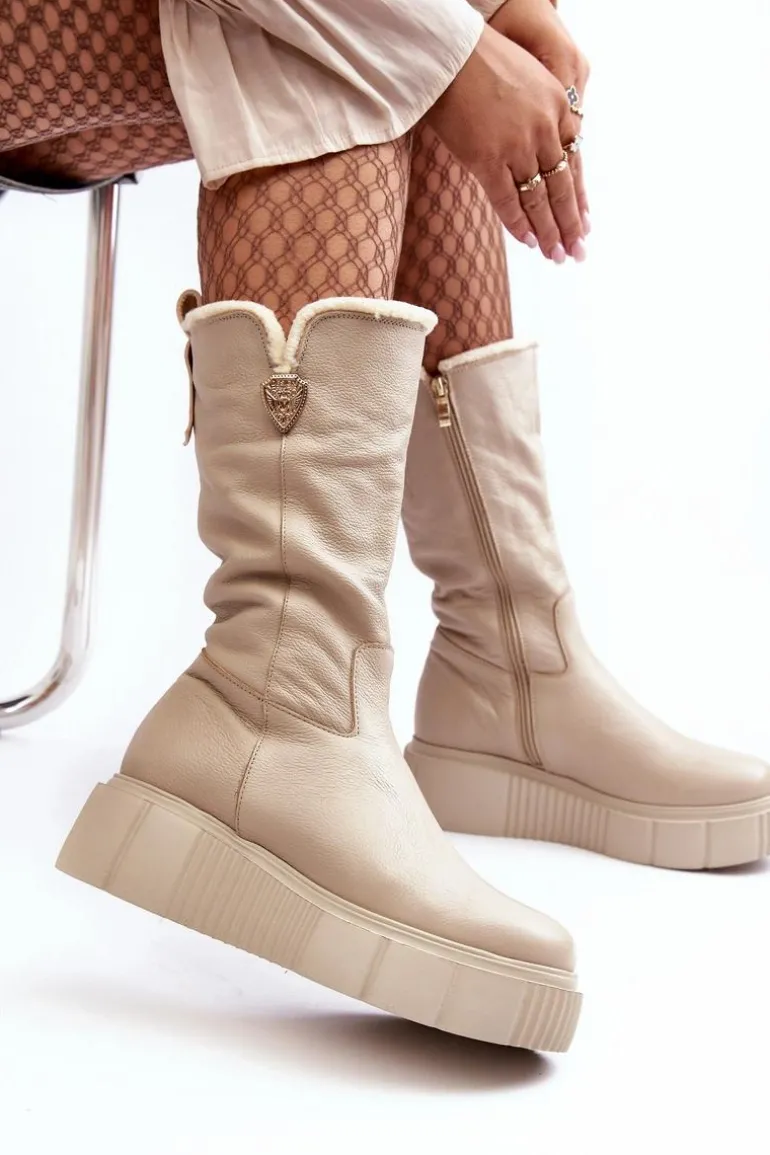 Damskie kozaki zostały wykonane z naturalnej skóry. Model ten posiada suwak z boku cholewki. Wnętrze zostało ocieplone naturalną wełną. Zapiętek jest usztywniany. Kozaki osadzono na masywnej platformie oraz koturnie. Posiadają ozdobny element z boku cholewki. Ten model świetnie sprawdzi się podczas chłodnych, zimowych dni. Przy wyborze rozmiaru prosimy sugerować się tabelą rozmiarów.