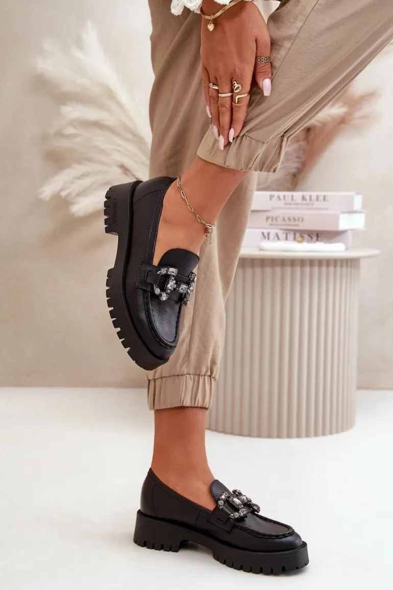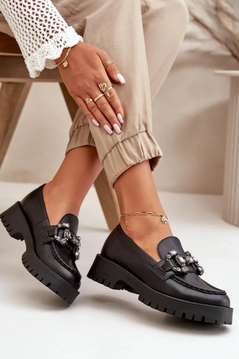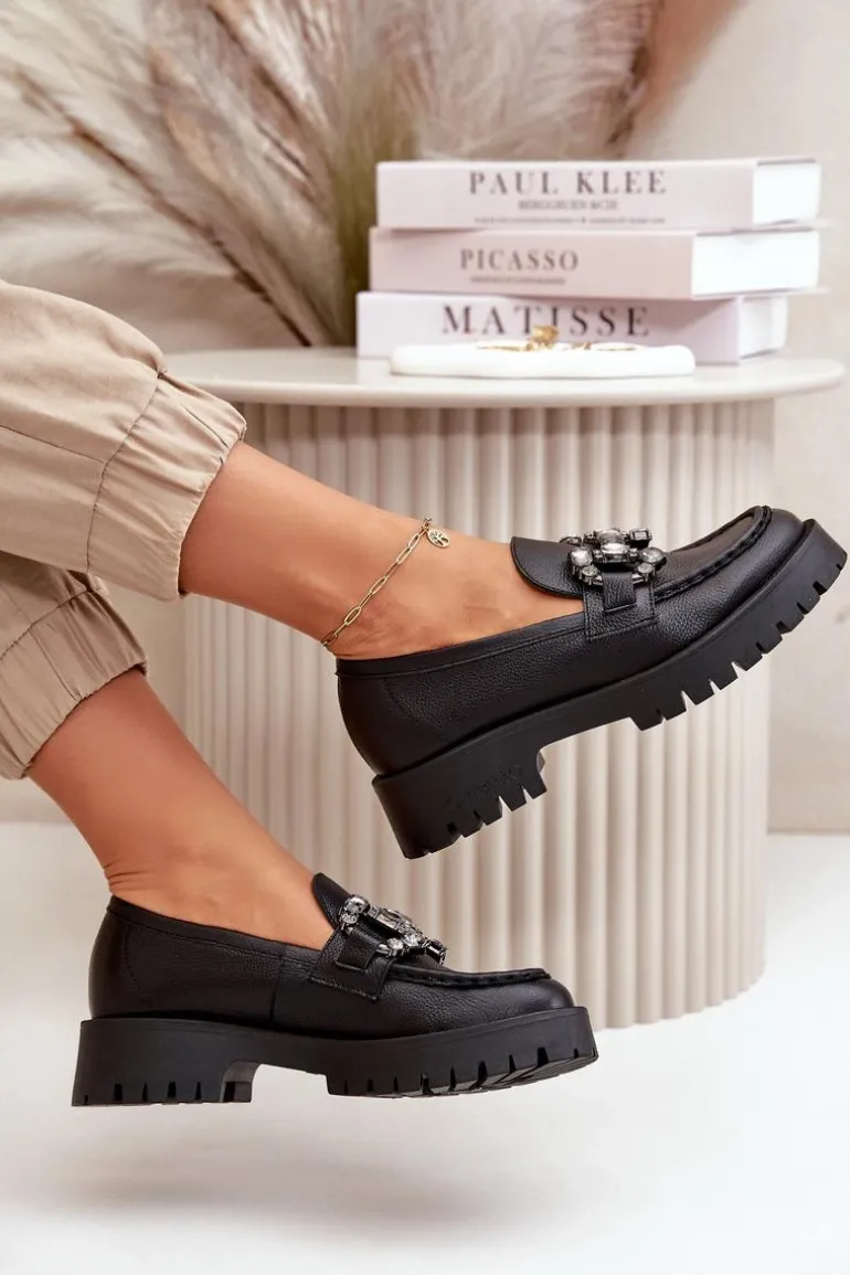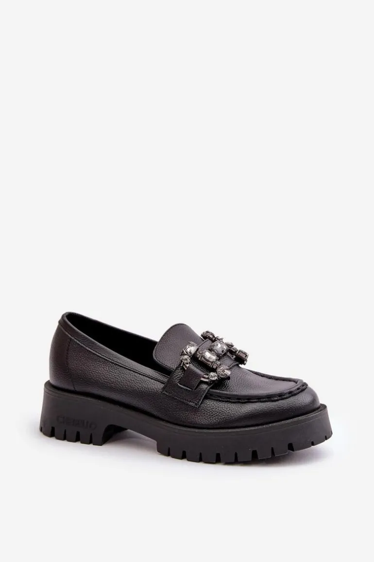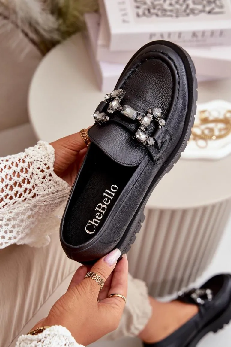 Eleganckie mokasyny od marki CheBello. Wykonane z wysokiej jakości skóry naturalnej. Osadzone na płaskim, masywnym obcasie. Noski zaokrąglone. Model ten posiada ozdobę z przodu. Skórzana wkładka zapewni komfort podczas noszenia. Fason ten idealnie dopełni stylizacje ze spodniami, spódnicami i sukienkami. Koniecznie powinnaś je mieć w swojej wiosennej garderobie. Przy wyborze rozmiaru prosimy sugerować się tabelą rozmiarów.