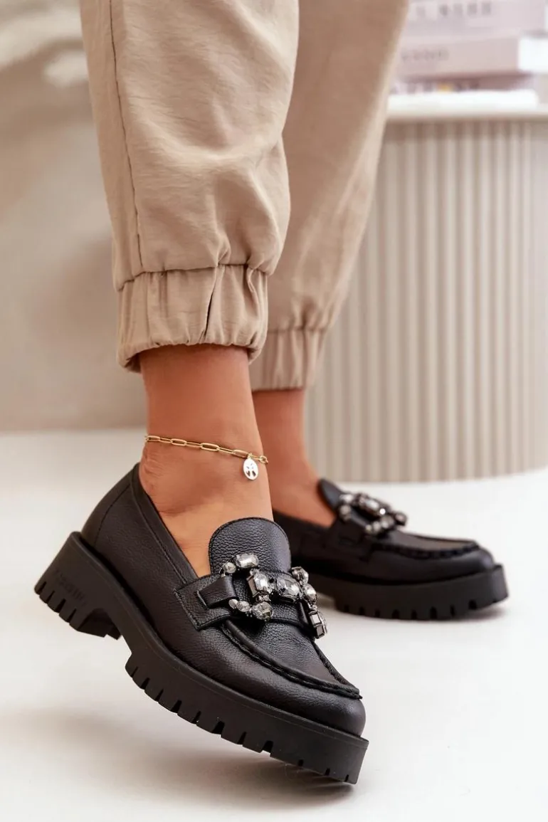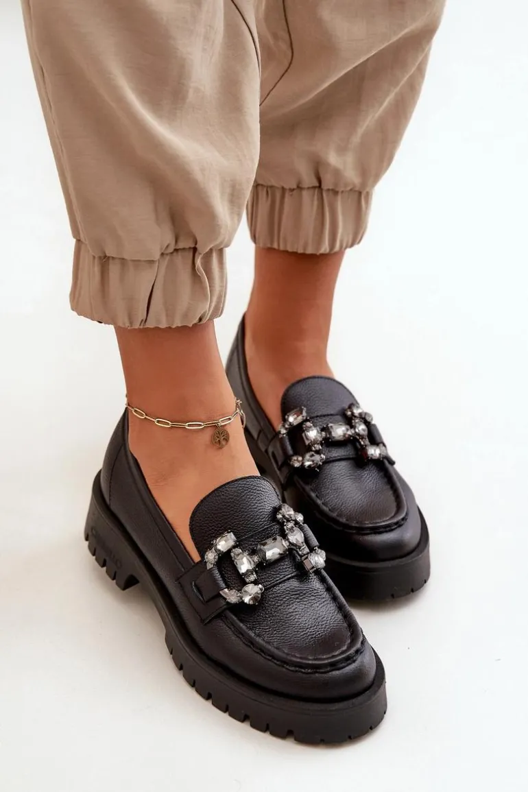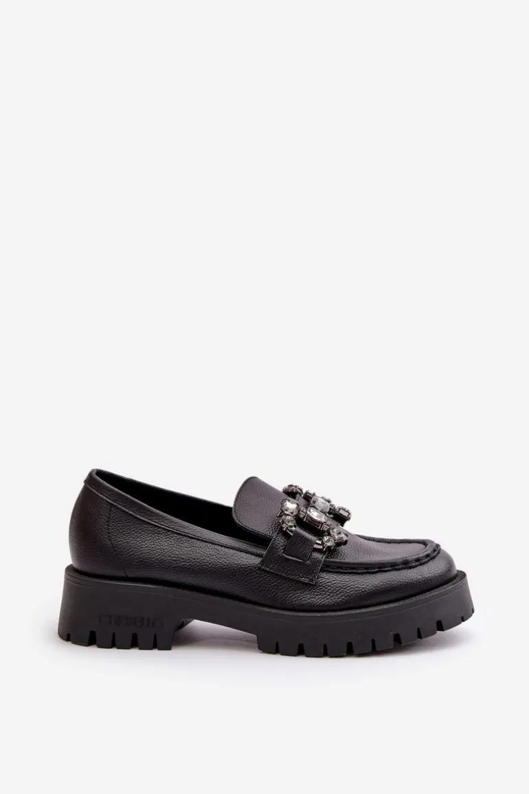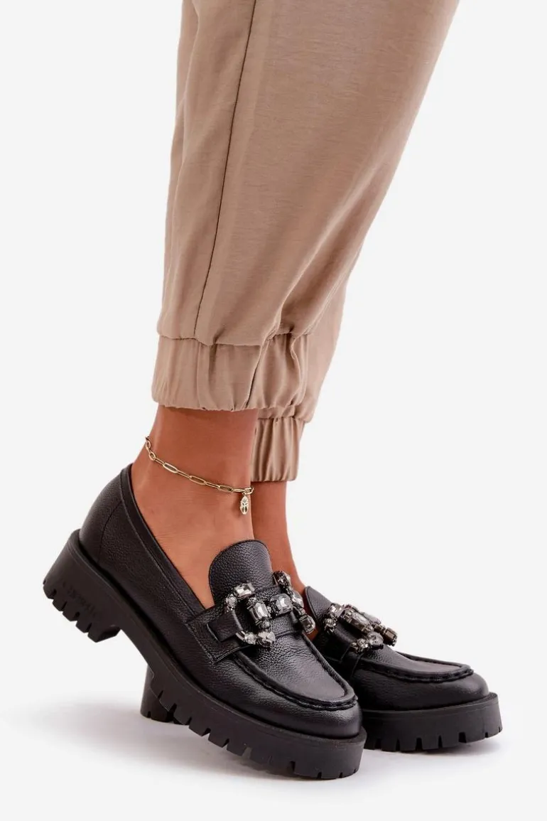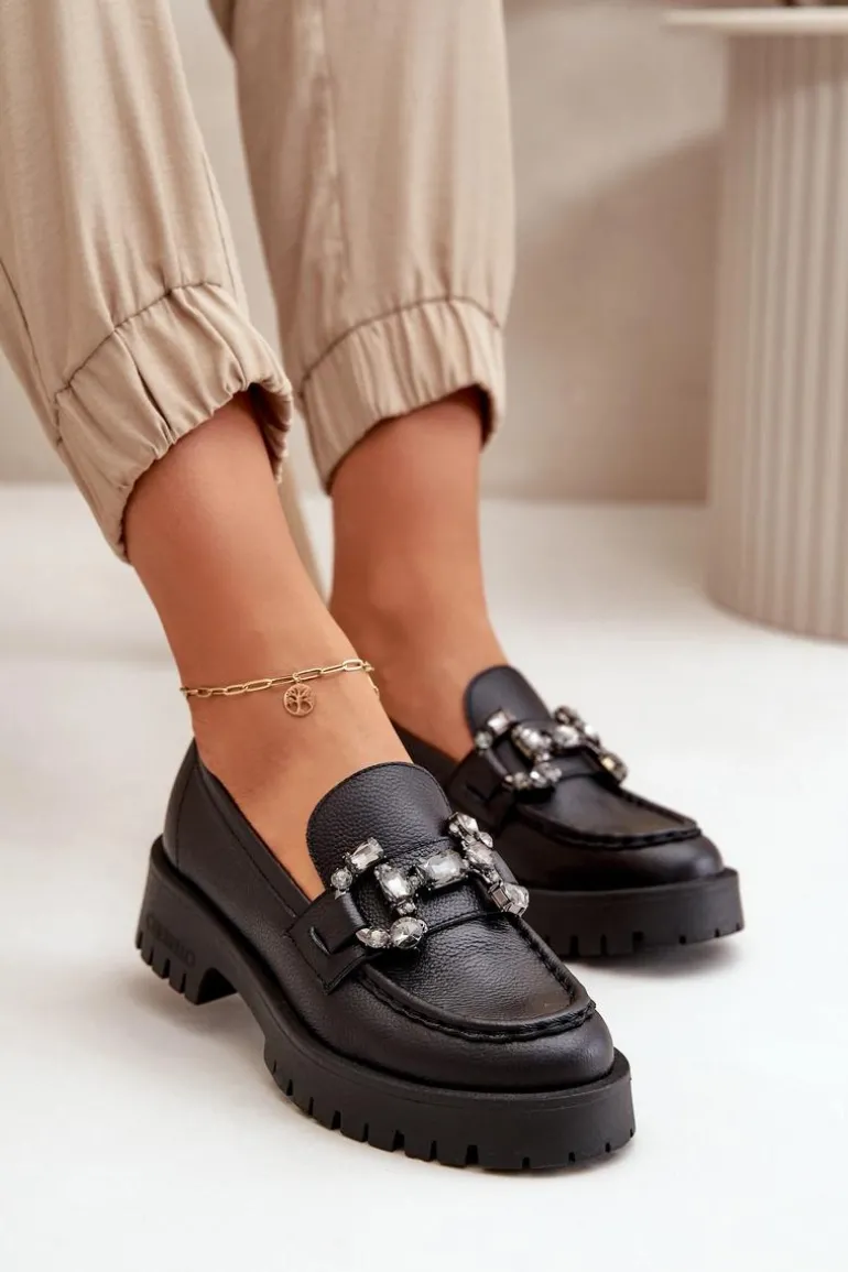 Eleganckie mokasyny od marki CheBello. Wykonane z wysokiej jakości skóry naturalnej. Osadzone na płaskim, masywnym obcasie. Noski zaokrąglone. Model ten posiada ozdobę z przodu. Skórzana wkładka zapewni komfort podczas noszenia. Fason ten idealnie dopełni stylizacje ze spodniami, spódnicami i sukienkami. Koniecznie powinnaś je mieć w swojej wiosennej garderobie. Przy wyborze rozmiaru prosimy sugerować się tabelą rozmiarów.