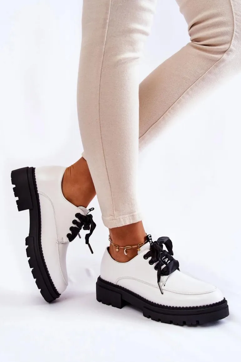 Modne półbuty damskie zostały wykonane z wysokiej jakości eko skórzanych materiałów. Miękka wkładka ze skóry naturalnej to gwarancja komfortu użytkowania nawet przez cały dzień. Sznurowanie w postaci wstążki sprawia, że te buty wyglądają naprawdę elegancko. Płaski, masywny obcas oraz delikatna platforma zapewnią stabilizację na każdym kroku. Ten model sprawdzi się w wielu stylizacjach! Podczas wyboru rozmiaru prosimy sugerować się tabelą rozmiarów.