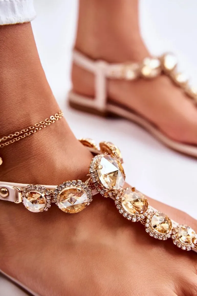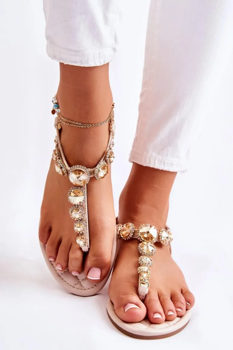 Modne sandały – japonki zostały wykonane z eko skóry. Buty te są niezwykle przewiewne. Cienkie paski zostały przyozdobione dżetami w postaci mieniących się kryształów oraz cyrkonii. Model zapinany na sprzączkę z regulowanym paskiem, dzięki któremu możesz je odpowiednio dopasować do tęgości nogi. Miękka wkładka jest dodatkowo pikowana. Sandały świetnie będą prezentować się z wieloma stylizacjami! Przy wyborze rozmiaru prosimy kierować się tabelą rozmiarów.