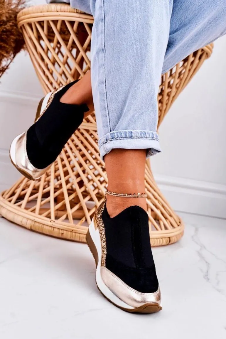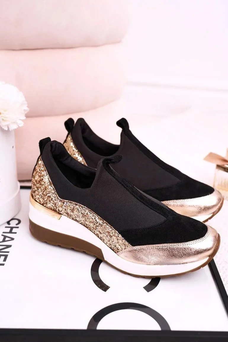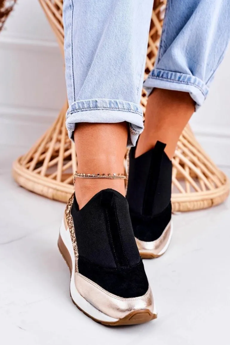 Damskie Skórzane Sneakersy Na Koturnie Czarne Złote Frances