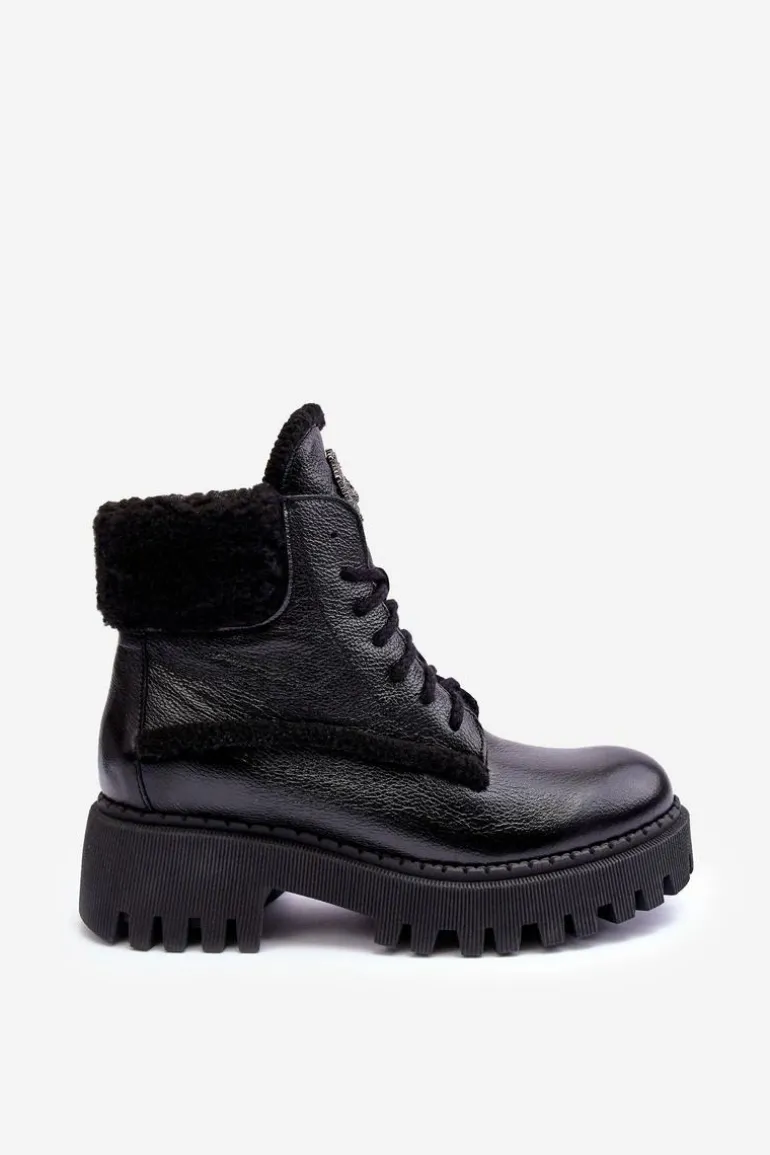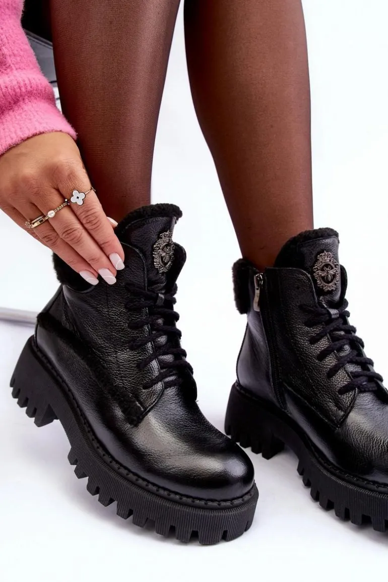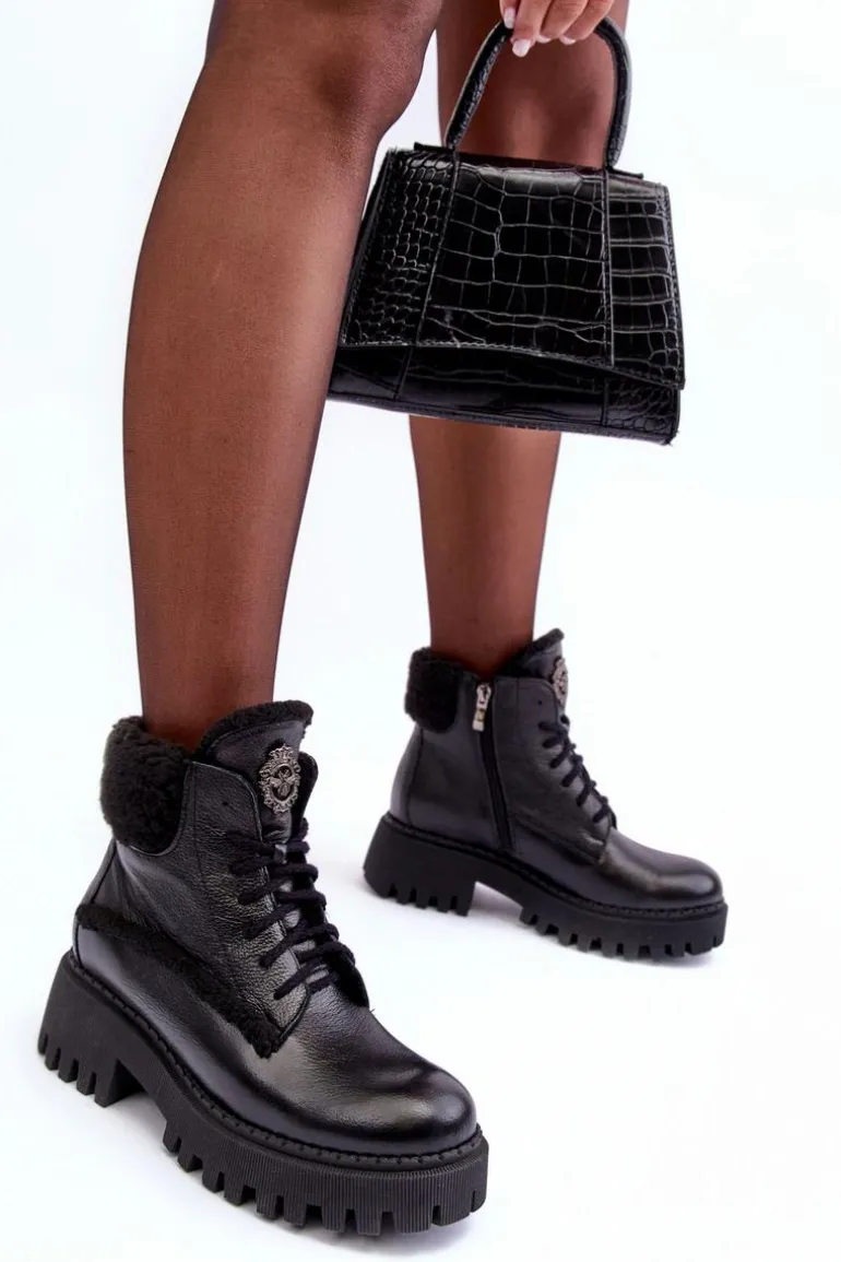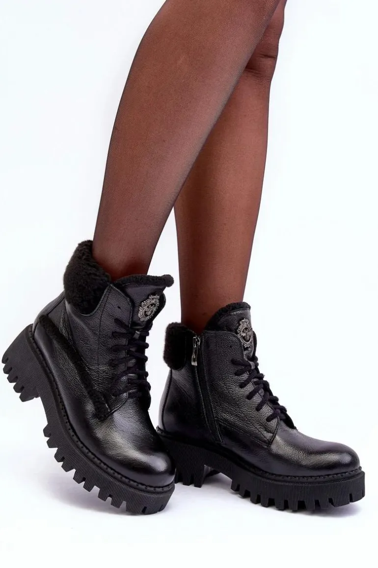 Botki w formie traperów zostały osadzone na masywnym obcasie. Podeszwa z bieżnikiem. Na języku znajduje się ozdobny element. Trapery wykonane zostały z wysokiej jakości naturalnych skór. Wewnątrz botki ocieplono wełną. Model ten posiada sznurowanie oraz suwak z boku cholewki. Dodatkowo zapiętek jest usztywniany. Przy wyborze rozmiaru prosimy sugerować się tabelą rozmiarów.