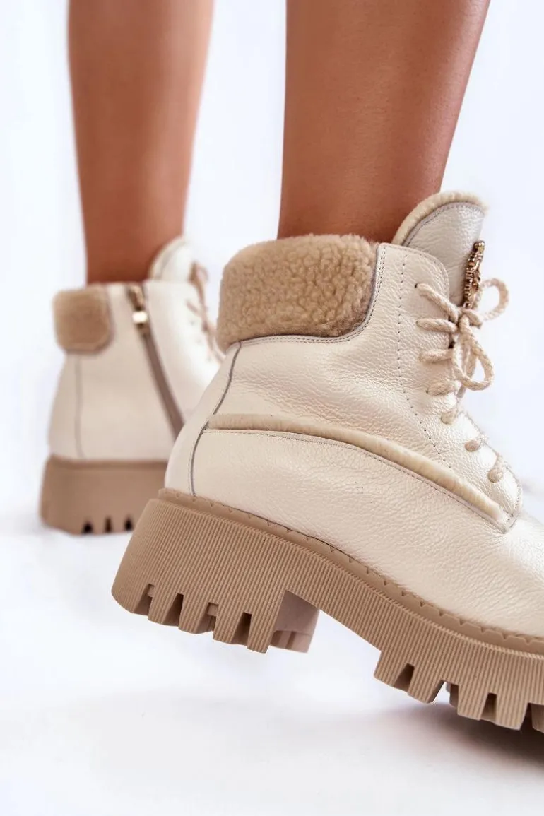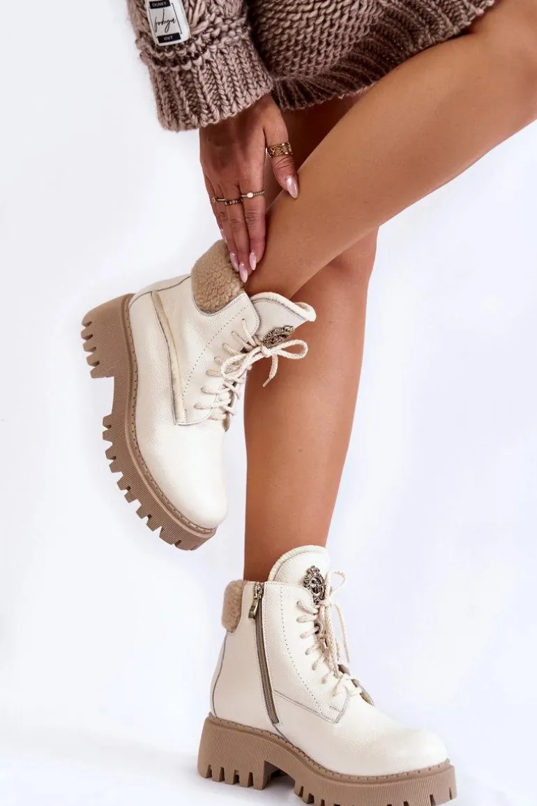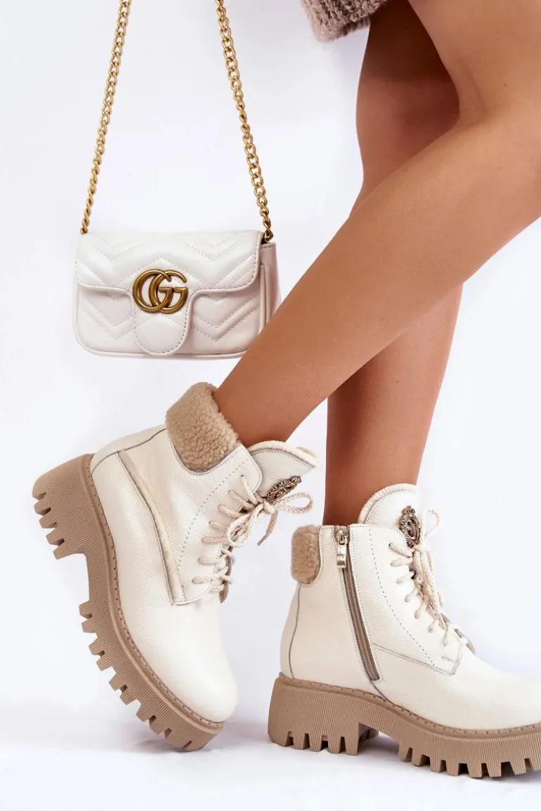 Botki w formie traperów zostały osadzone na masywnym obcasie. Podeszwa z bieżnikiem. Na języku znajduje się ozdobny element. Trapery wykonane zostały z wysokiej jakości naturalnych skór. Wewnątrz botki ocieplono wełną. Model ten posiada sznurowanie oraz suwak z boku cholewki. Dodatkowo zapiętek jest usztywniany. Przy wyborze rozmiaru prosimy sugerować się tabelą rozmiarów.