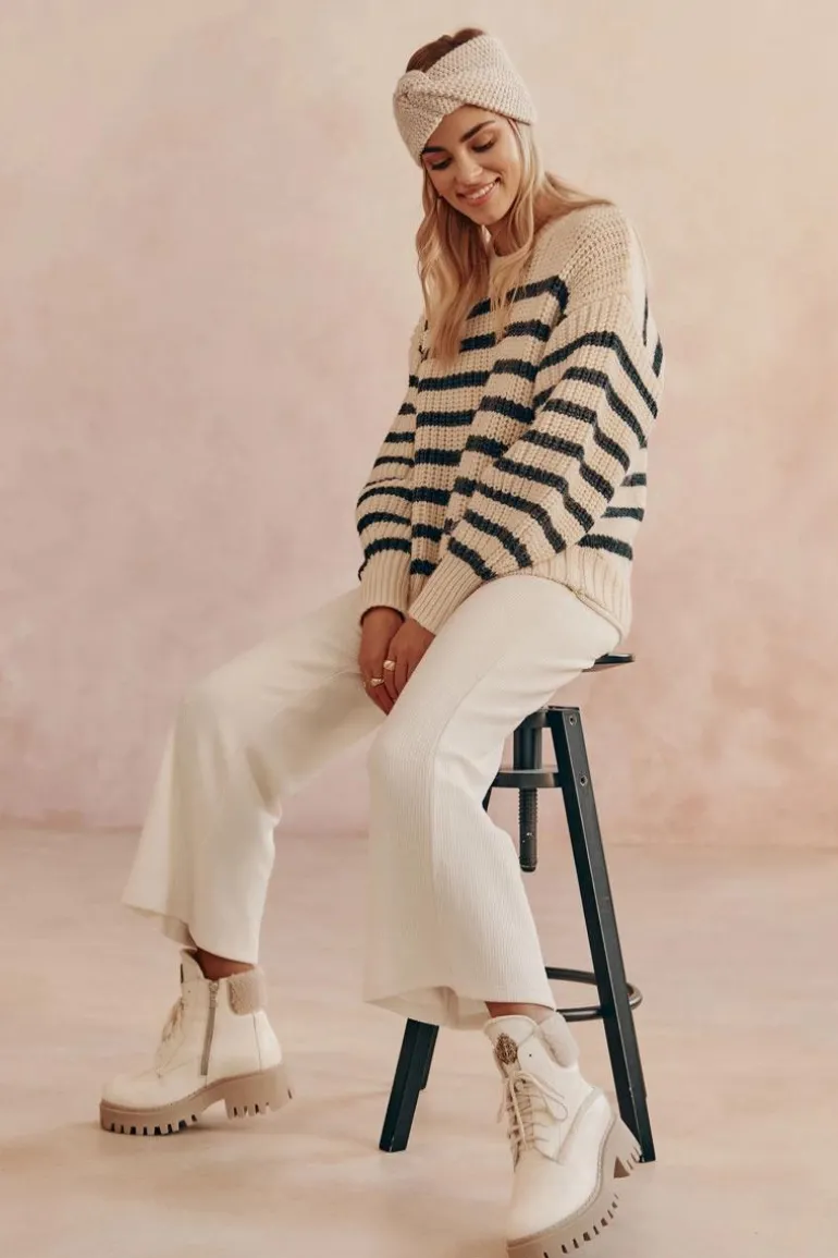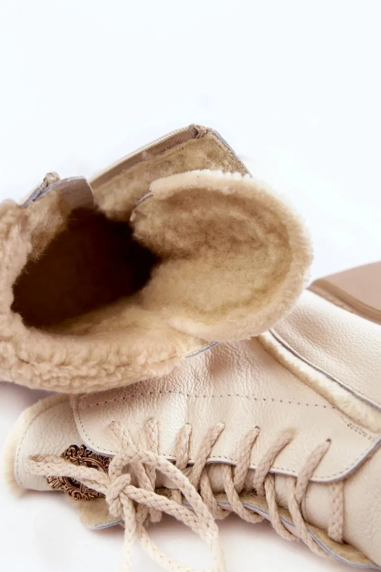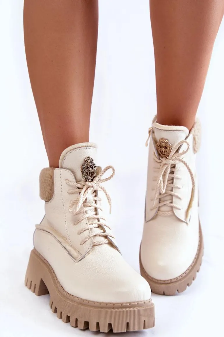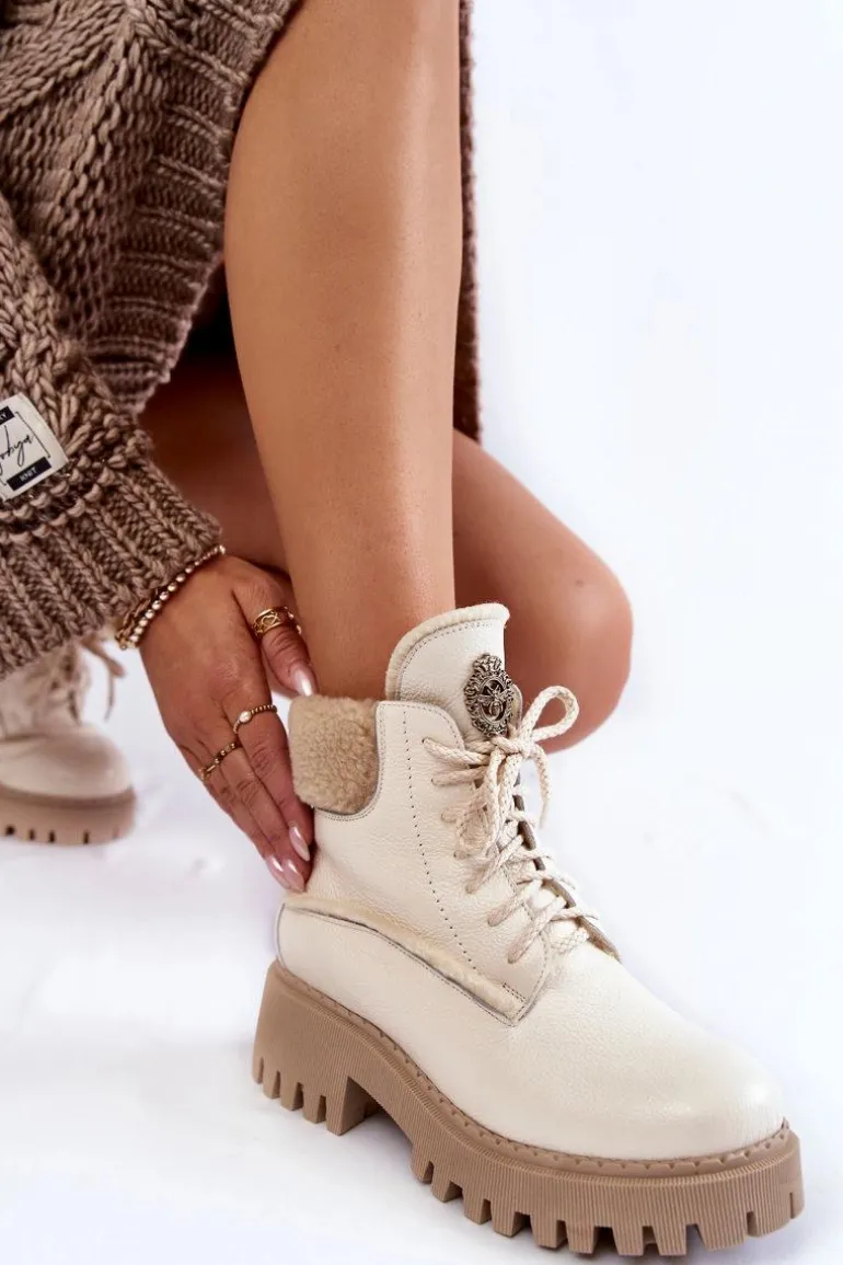 Botki w formie traperów zostały osadzone na masywnym obcasie. Podeszwa z bieżnikiem. Na języku znajduje się ozdobny element. Trapery wykonane zostały z wysokiej jakości naturalnych skór. Wewnątrz botki ocieplono wełną. Model ten posiada sznurowanie oraz suwak z boku cholewki. Dodatkowo zapiętek jest usztywniany. Przy wyborze rozmiaru prosimy sugerować się tabelą rozmiarów.