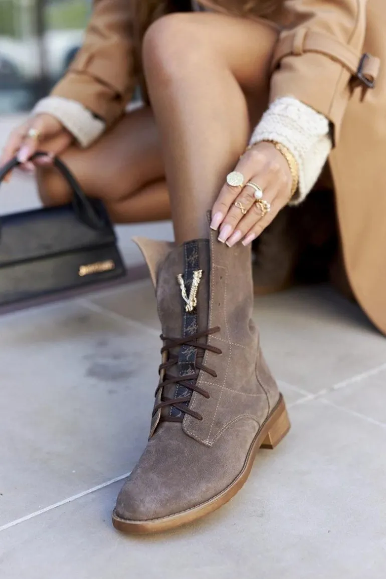 Przepiękne i modne botki marki Nicole. Buty w całości wykonane z naturalnej skóry welurowej. Wysokie botki sięgające aż do łydek. Delikatne zdobienie na języku w postaci złotej literki V. Klasycznie sznurowane z dodatkowym suwakiem na boku. Sprawdź całą kolekcję marki Nicole. Przy wyborze rozmiaru prosimy sugerować się tabelą rozmiarów.