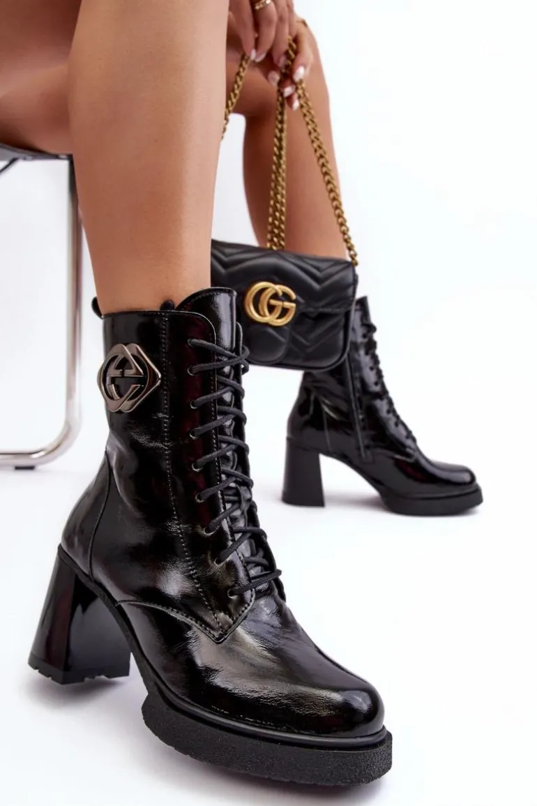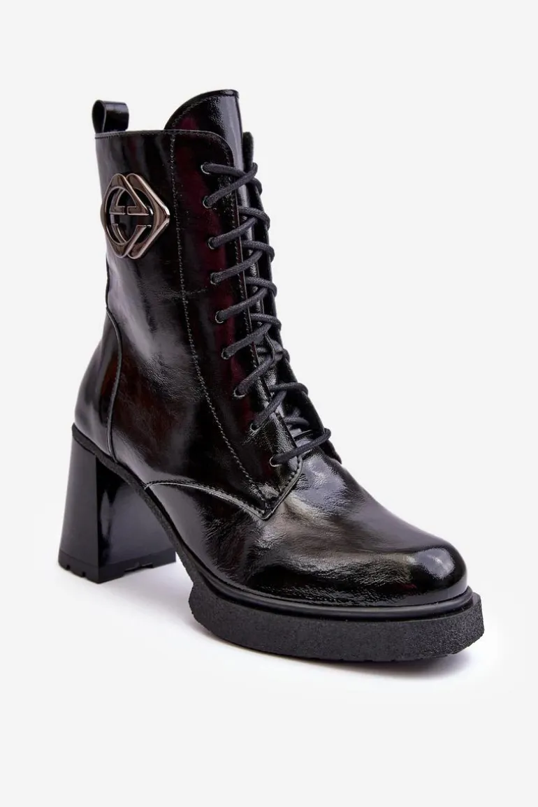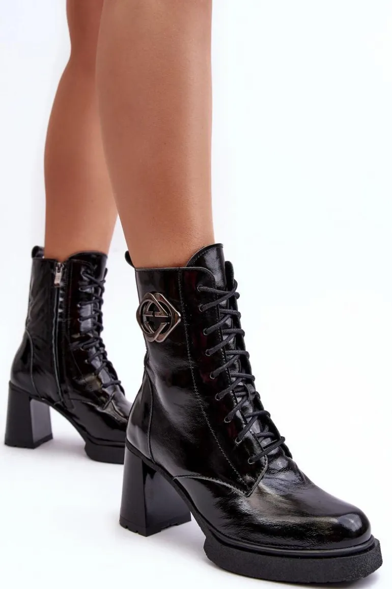 Modne i wygodne damskie botki zostały wykonane z wysokiej jakości naturalnych skór. Model ten jest klasycznie sznurowany oraz posiada suwak z boku cholewki. Botki osadzono na platformie i obcasie w postaci słupka. Środek został ocieplony kocem obuwniczym. Wysoka cholewka oraz usztywniany zapiętek zapewnią odpowiednią stabilizację nogi. Ten model właśnie powinien znaleźć się w Twojej szafie! Przy wyborze rozmiaru prosimy kierować się tabelą rozmiarów.