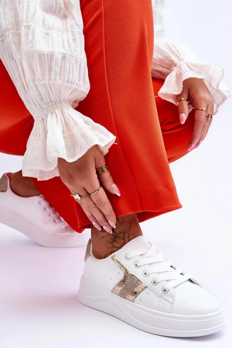 Klasyczne, damskie sneakersy zostały wykonane z eko skóry. Z boku oraz z tyłu cholewki zostały dodatkowo ozdobione brokatem. Buty sportowe posiadają klasyczne sznurowanie. Model ten został osadzony na masywnej platformie z gumowego tworzywa. Te buty sportowe z pewnością sprawdzą się w wielu stylizacjach! Przy wyborze rozmiaru prosimy kierować tabelą rozmiarów.