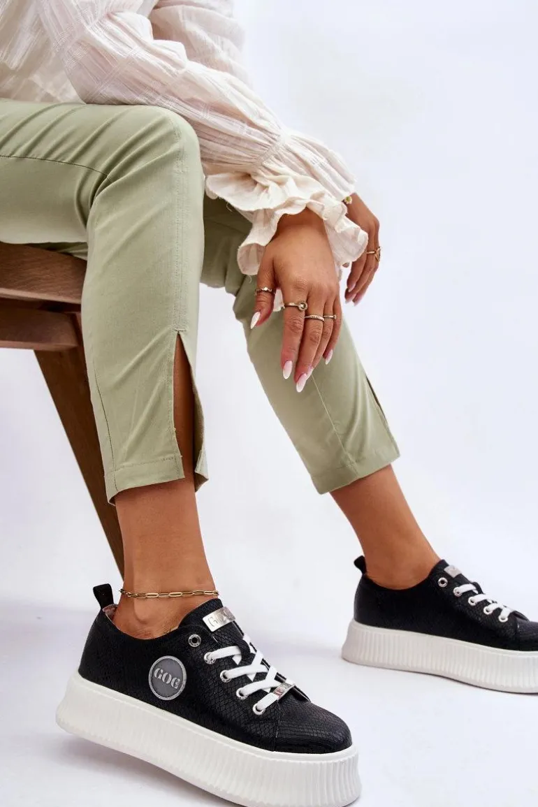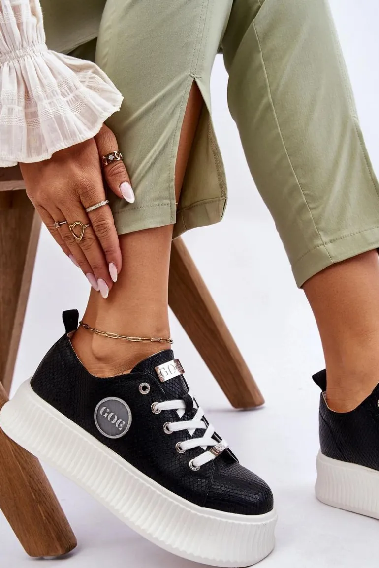 Świetne sneakersy damskie wykonane z wysokiej jakości eko skóry. Ten modny fason idealnie będzie komponował się z codziennymi stylizacjami. Klasycznie sznurowany model posiada z boku gumowy emblemat z logo marki GOE. Miękka, eko skórzana wkładka sprawi, że będziesz czuć się w nich komfortowo przez cały dzień. Masywna platforma posiada żłobienia po bokach. Przy wyborze rozmiaru prosimy sugerować się tabelą rozmiarów.