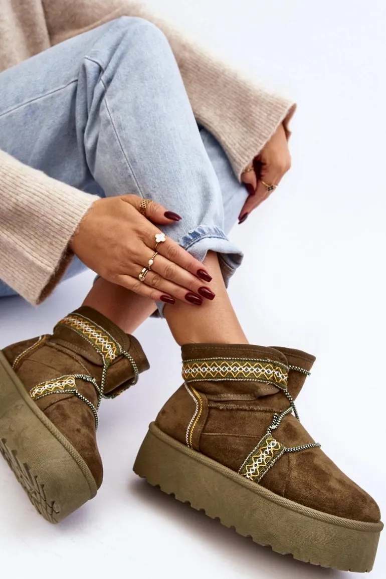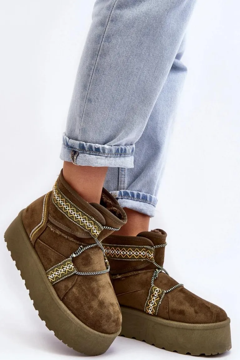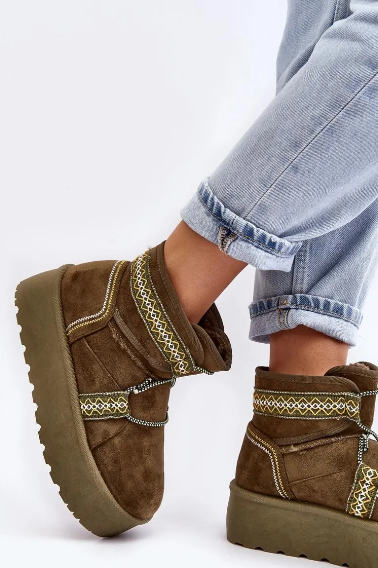 Śniegowce damskie z modnym wzorem i wiązaniem na cholewce. Wykonane z eko zamszu. Osadzone na masywnej platformie z gumowego tworzywa, która świetnie odizoluje od zimnego podłoża. Cholewka za kostkę. Środek ocieplony futerkiem. Koniecznie musisz je mieć! Przy wyborze rozmiaru prosimy sugerować się tabelą rozmiarów.