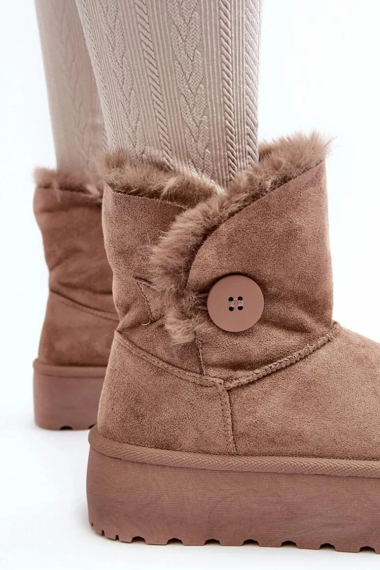 Śniegowce damskie osadzone na grubej platformie z gumowego tworzywa. Cholewka za kostkę, ozdobiona guzikiem i futerkiem. Wykonane z eko zamszu. Środek ocieplony. Ten modny model świetnie sprawdzi się w sezonie jesienno-zimowym. Koniecznie musisz je mieć! Przy wyborze rozmiaru prosimy sugerować się tabelą rozmiarów.