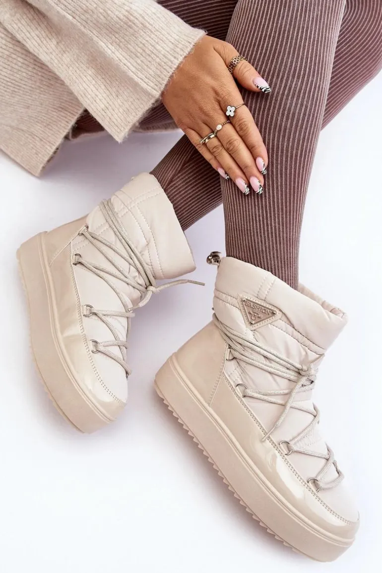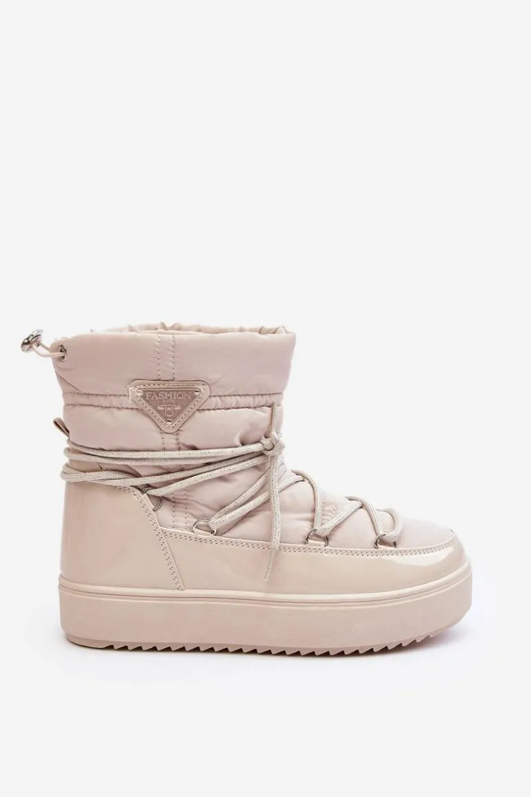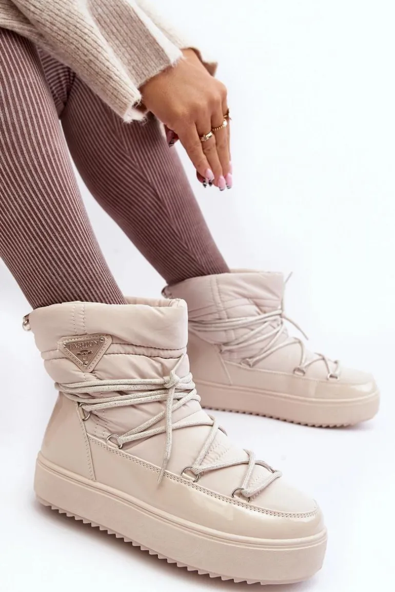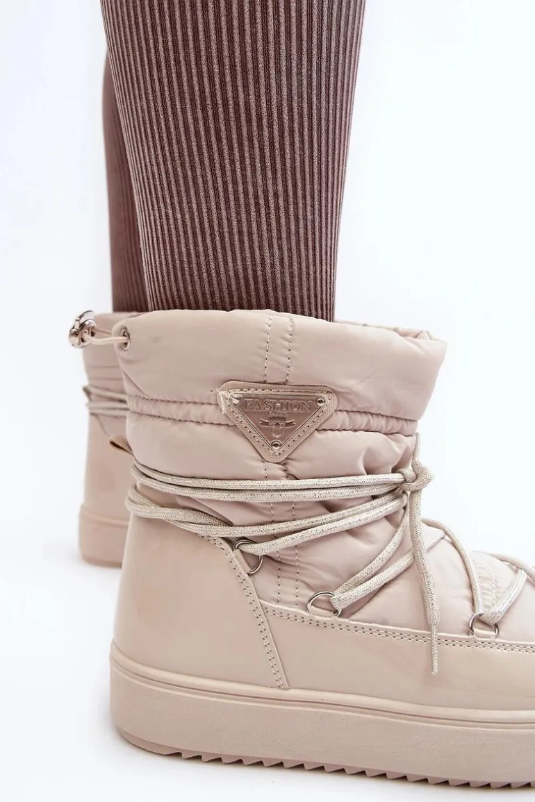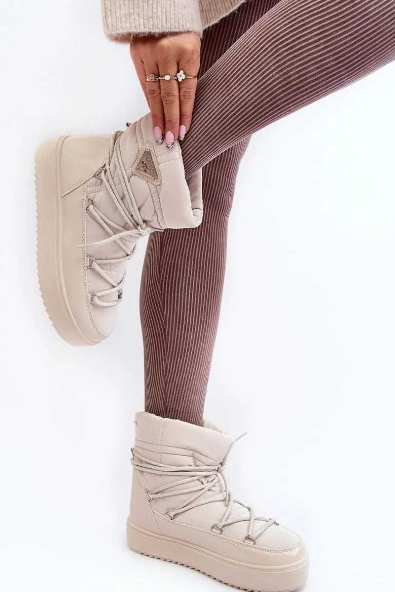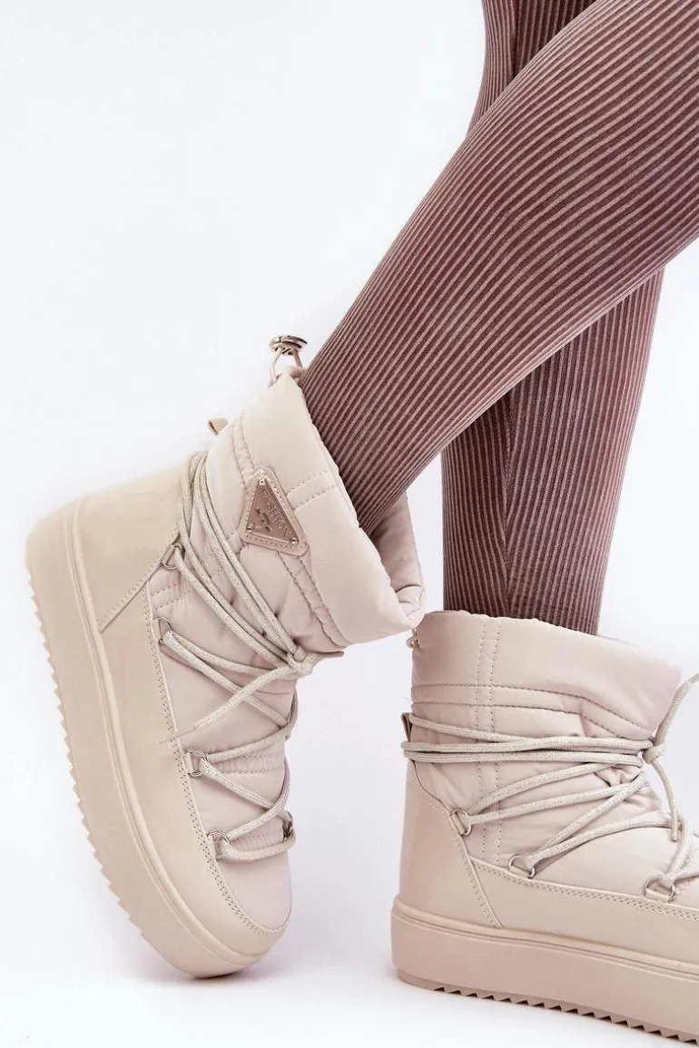 Śniegowce damskie z cholewką za kostkę. Wykonane z połączenia materiału tekstylnego i eko skóry. Osadzone na grubej podeszwie, która świetnie odizoluje od zimnego podłoża. Model wsuwany z błyszczącymi sznurówkami. Środek ocieplony futerkiem. Idealne na mroźne dni! Koniecznie powinnaś je mieć! Przy wyborze rozmiaru prosimy sugerować się tabelą rozmiarów.