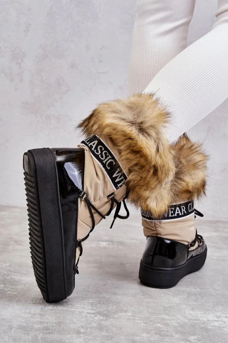 Modne śniegowce zostały wykonane z materiału odpornego na zimno i wiatr. Cholewka zakończona sztucznym futerkiem. Model klasycznie sznurowany. Śniegowce zostały osadzone na masywnej platformie. Posiadają w środku ocieplenie w postaci grubego futerka. Dekorowane tasiemką z nadrukiem. Niezwykle ciepłe, a zarazem stylowe. Powinnaś je mieć! Przy wyborze rozmiaru prosimy sugerować się tabelą rozmiarów.