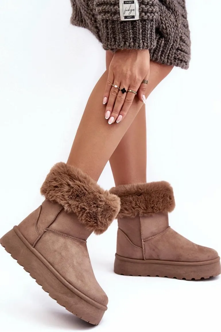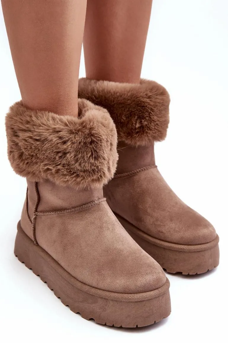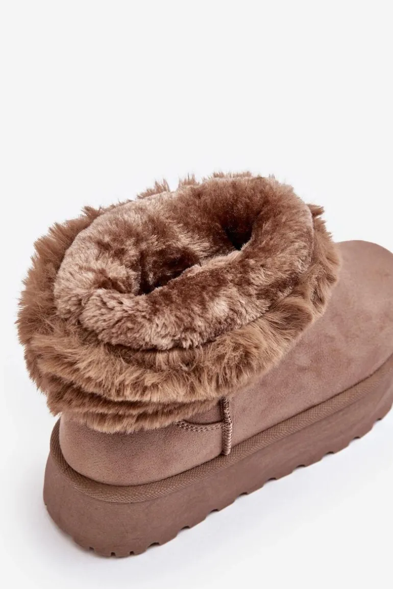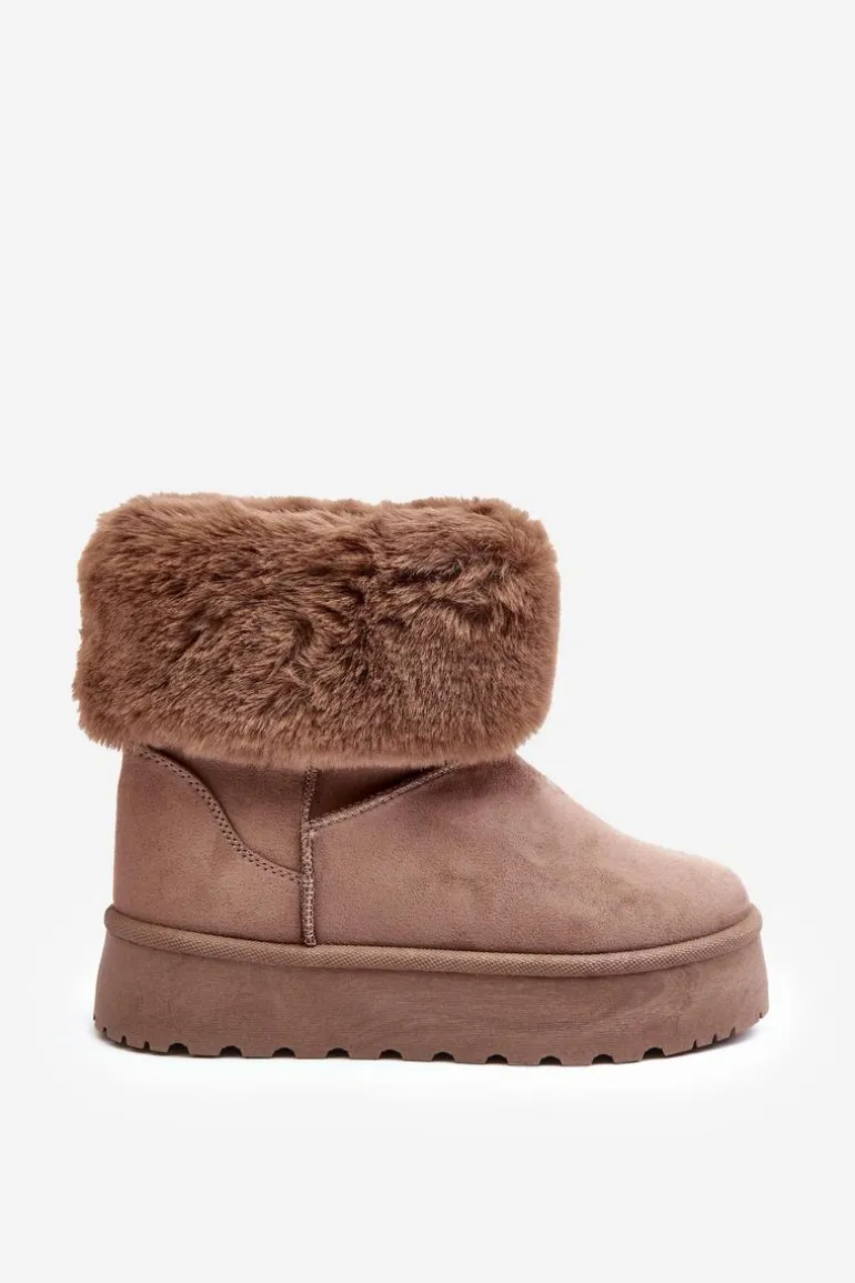 Modne śniegowce idealnie sprawdzą się w sezonie jesienno-zimowym. Wykonane z eko zamszu. Osadzone na grubej podeszwie. Wnętrze ocieplone grubym futerkiem. Model wsuwany z cholewką za kostkę. Idealne dla osób, które cenią sobie wygodę oraz ciepło w mroźne dni! Po prostu musisz je mieć! Przy wyborze rozmiaru prosimy sugerować się tabelą rozmiarów.