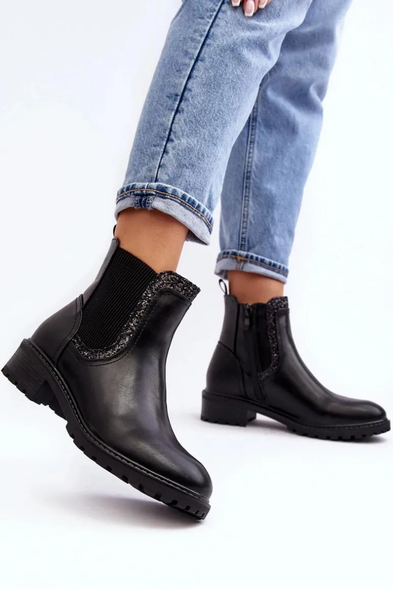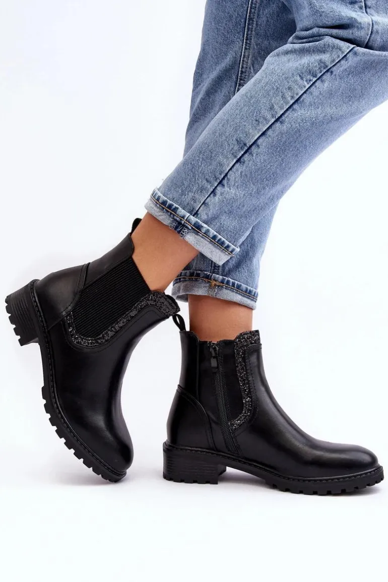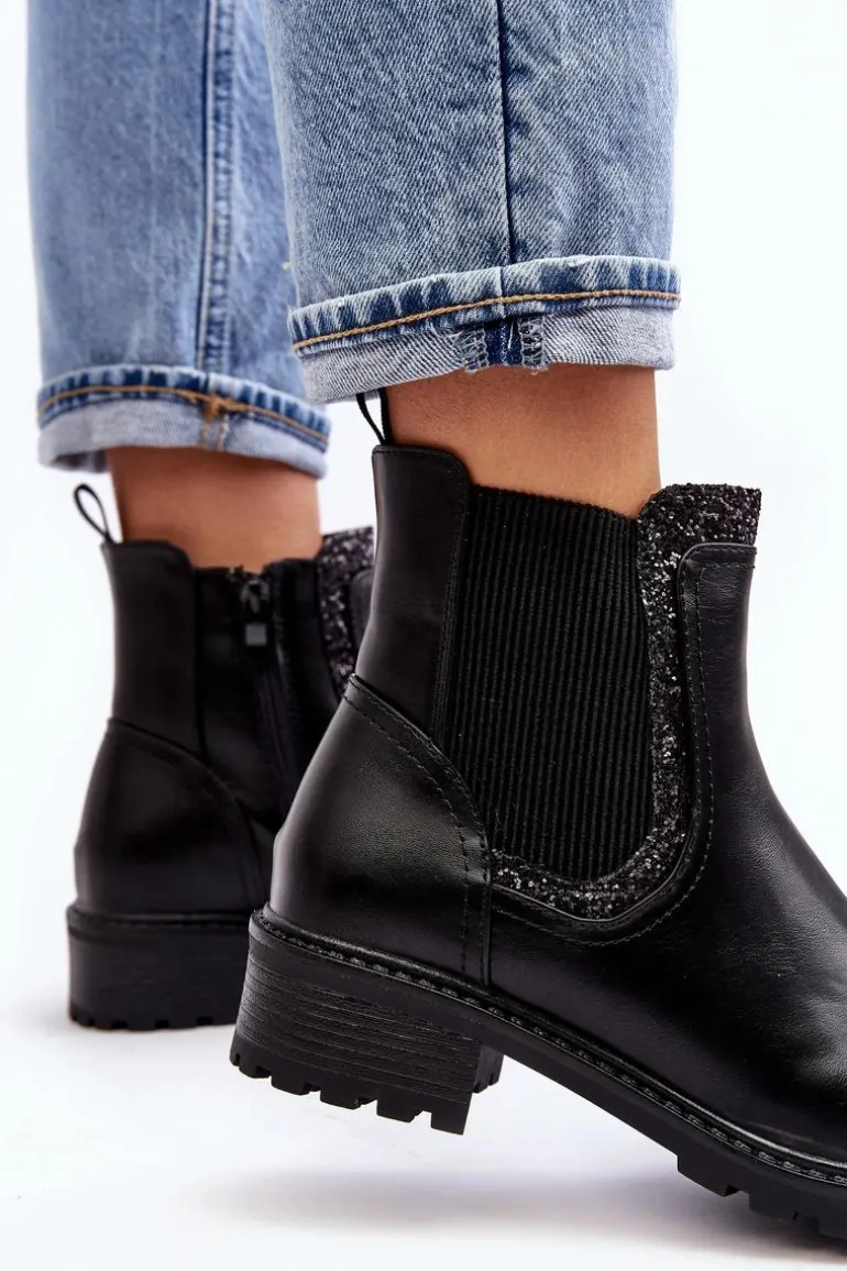 Botki damskie z cholewką za kostkę. Wykonane z eko skóry. Osadzone na płaskim, stabilnym obcasie. Zapinane na zamek z boku. Cholewka ozdobiona cekinami. Noski zaokrąglone. Usztywniony zapiętek. Ten klasyczny model dopasujesz do wielu jesienno-zimowych stylizacji! Przy wyborze rozmiaru prosimy sugerować się tabelą rozmiarów.