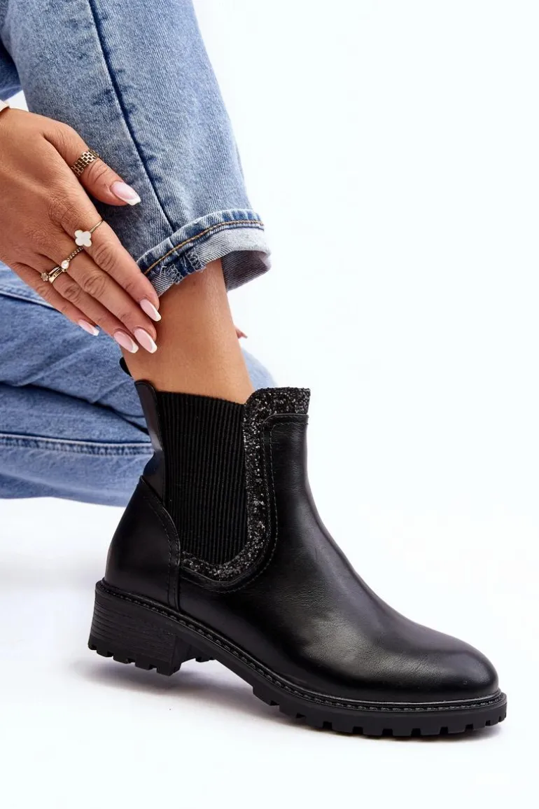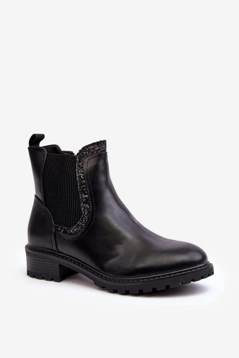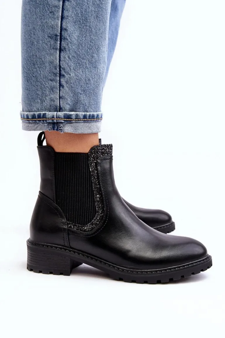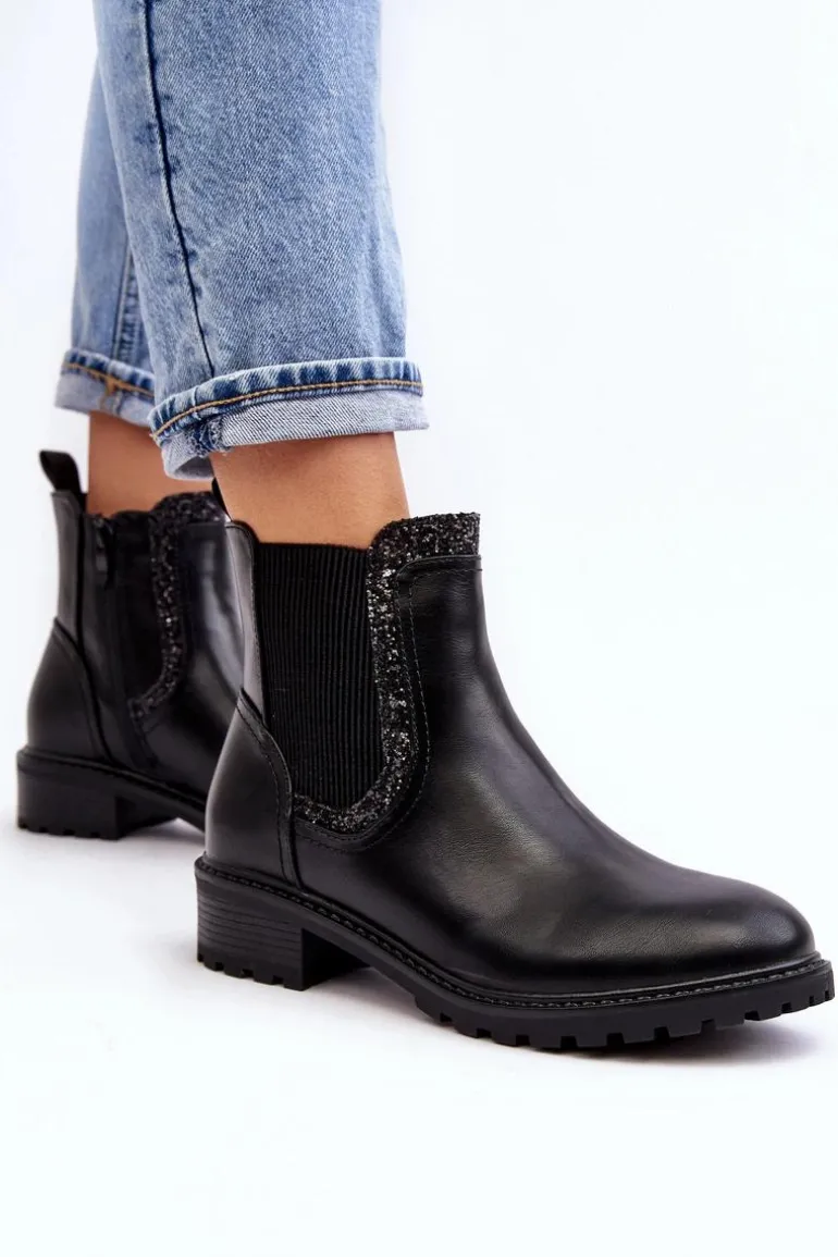 Botki damskie z cholewką za kostkę. Wykonane z eko skóry. Osadzone na płaskim, stabilnym obcasie. Zapinane na zamek z boku. Cholewka ozdobiona cekinami. Noski zaokrąglone. Usztywniony zapiętek. Ten klasyczny model dopasujesz do wielu jesienno-zimowych stylizacji! Przy wyborze rozmiaru prosimy sugerować się tabelą rozmiarów.
