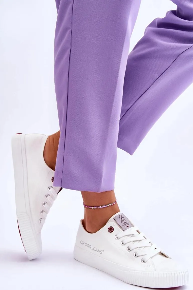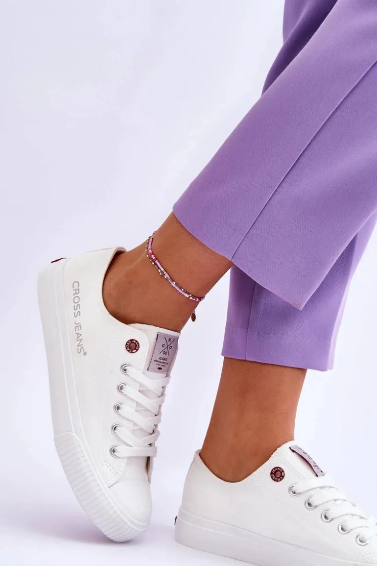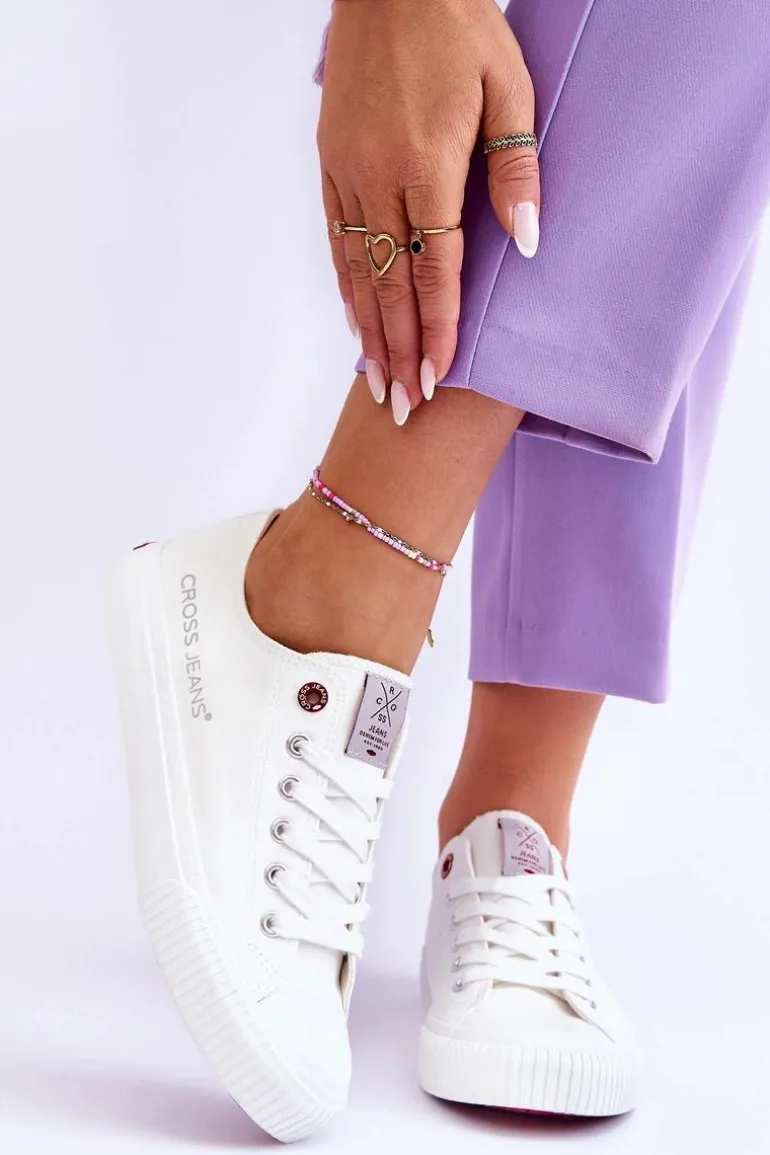 Klasyczne, damskie trampki marki Cross Jeans zostały wykonane z materiału tekstylnego. Buty te idealnie dopasowują się do kształtu stopy. Trampki posiadają miękką, materiałową wkładkę. Dodatkowo usztywniany zapiętek zapewni odpowiednią stabilizację stopy. Podeszwa wykonana z gumowego tworzywa jest antypoślizgowa. Klasyczny, sznurowany model, który łatwo dopasujesz do tęgości stopy. Trampki posiadają wzmocniony, gumowy nosek. Przy wyborze rozmiaru prosimy sugerować się tabelą rozmiarów.