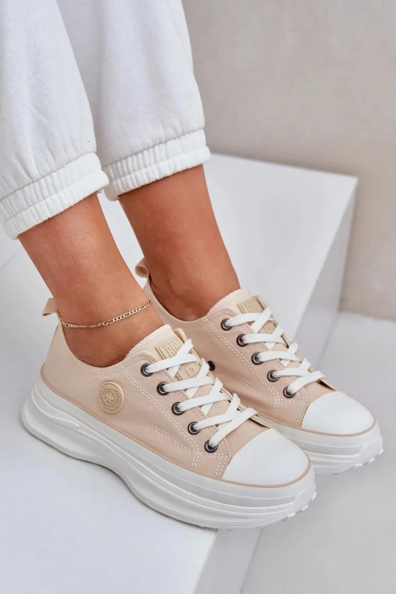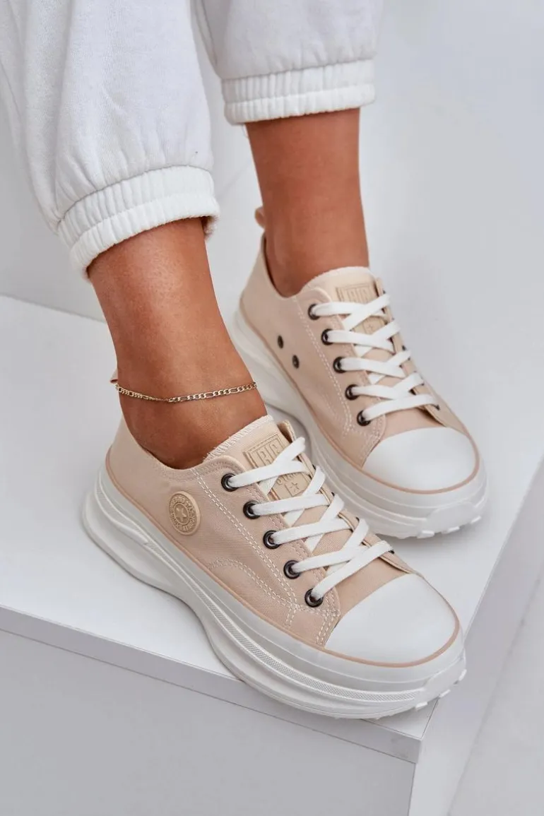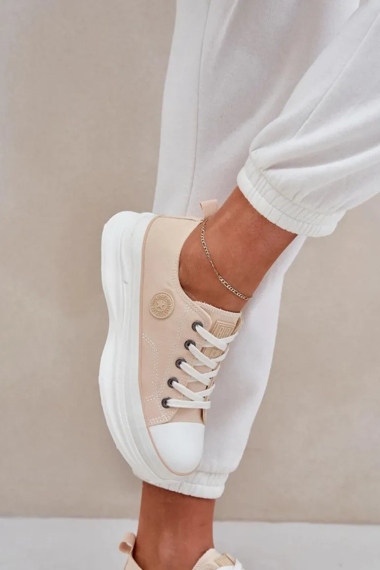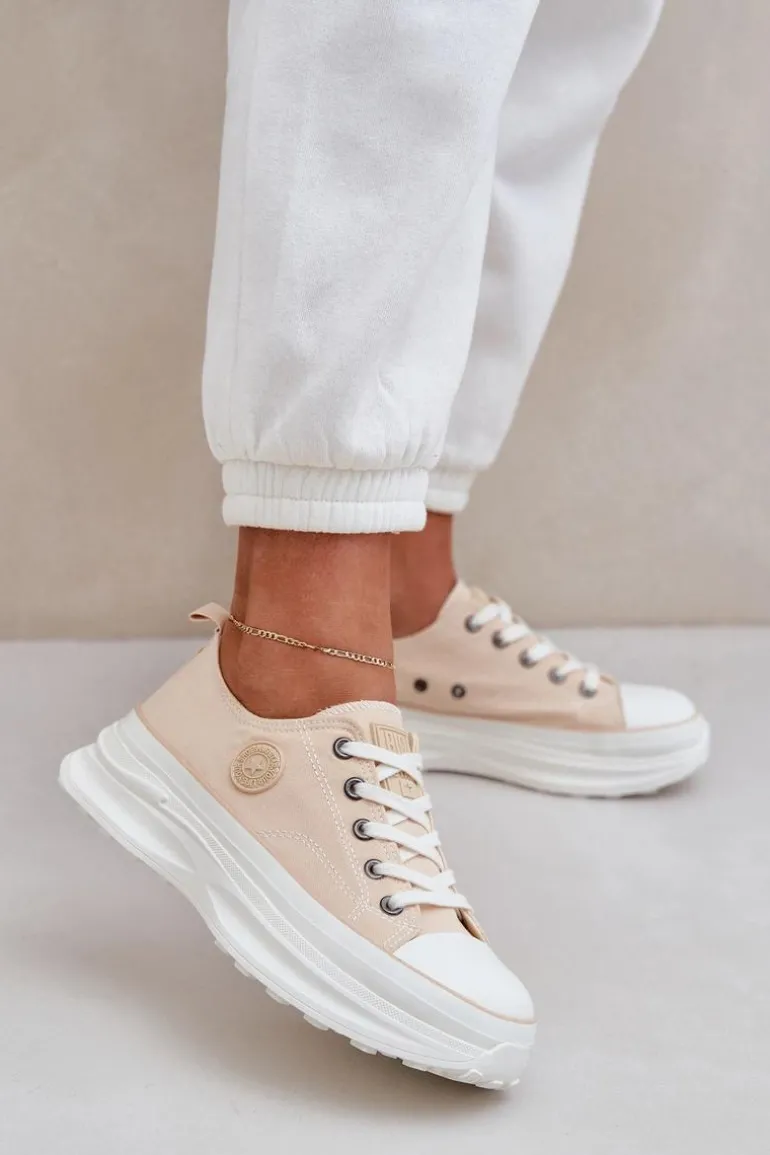 Trampki na platformie z logo Big Star to absolutny must-have dla tych, którzy cenią sobie modę i komfort. Dzięki platformie buty nie tylko świetnie wyglądają, ale także zapewniają stabilność i wsparcie dla stopy, co czyni je idealnym wyborem na długie spacery czy wieczorne wyjścia. Ich delikatny różowy kolor sprawia, że doskonale pasują do wielu stylizacji, dodając im nuty świeżości i oryginalności. Przy wyborze rozmiaru prosimy sugerować się tabelą rozmiarów.