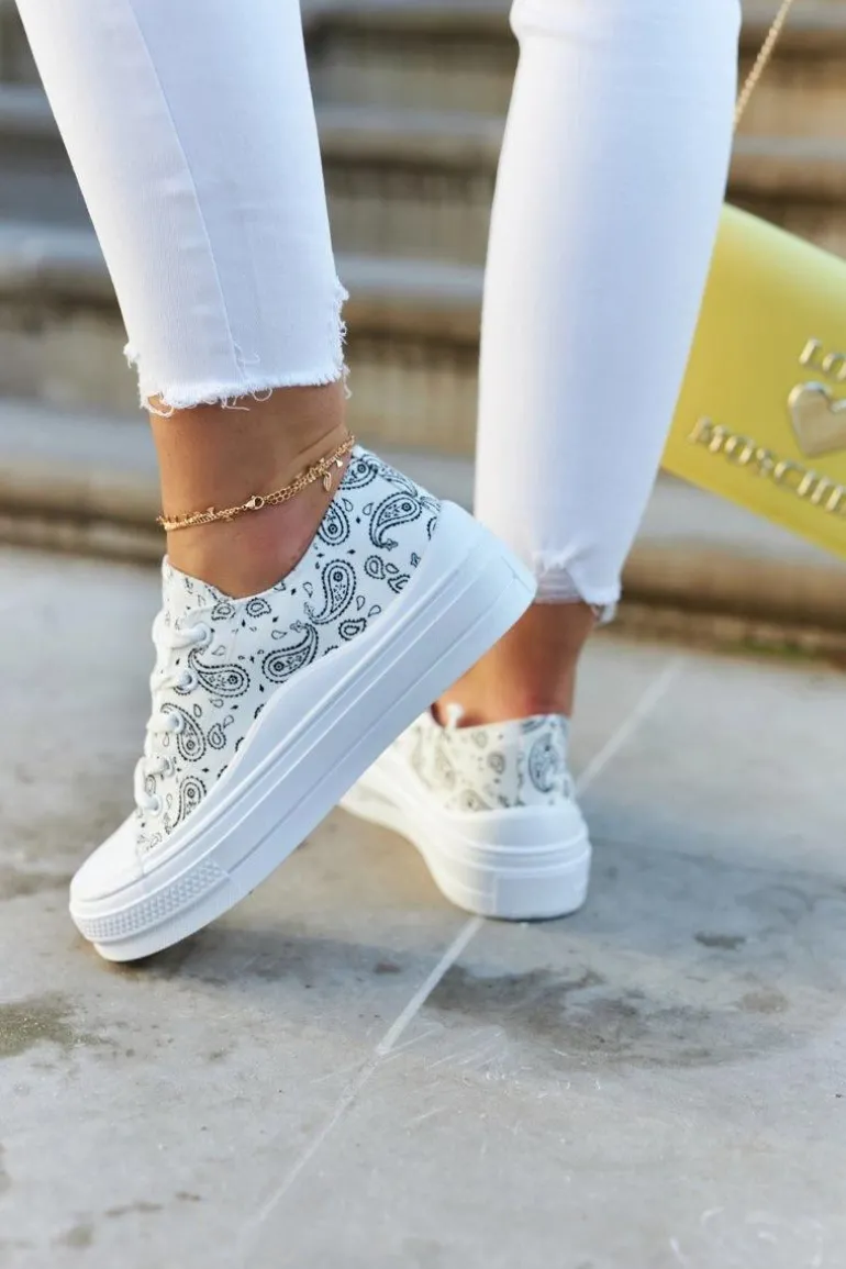 Trampki na masywnej, gumowej platformie w świetny print. Buty dobrze dopasowują się do kształtu stopy, dzięki cholewce wykonanej z materiału tekstylnego. Posiadają klasyczne, płaskie sznurowadła oraz wyciąganą, wkładkę, która jest wykonana także z materiału. Idealne na co dzień, do szkoły, czy na spotkanie ze znajomymi. Koniecznie sprawdź całą naszą kolekcję trampek! Przy wyborze rozmiaru prosimy sugerować się tabelą rozmiarów.